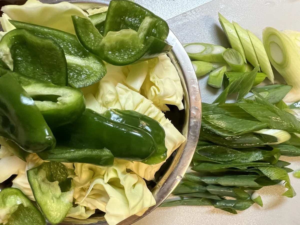 ②キャベツ、ピーマン🫑はざく切り、ネギは斜めに切っておく。