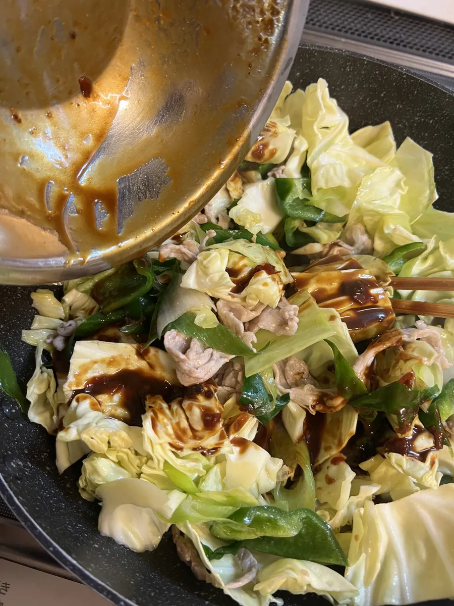 ③フライパンに油を引き、豚肉を炒め色が変わったら長ネギ、キャベツ、ピーマンを入れ、サッと炒める。