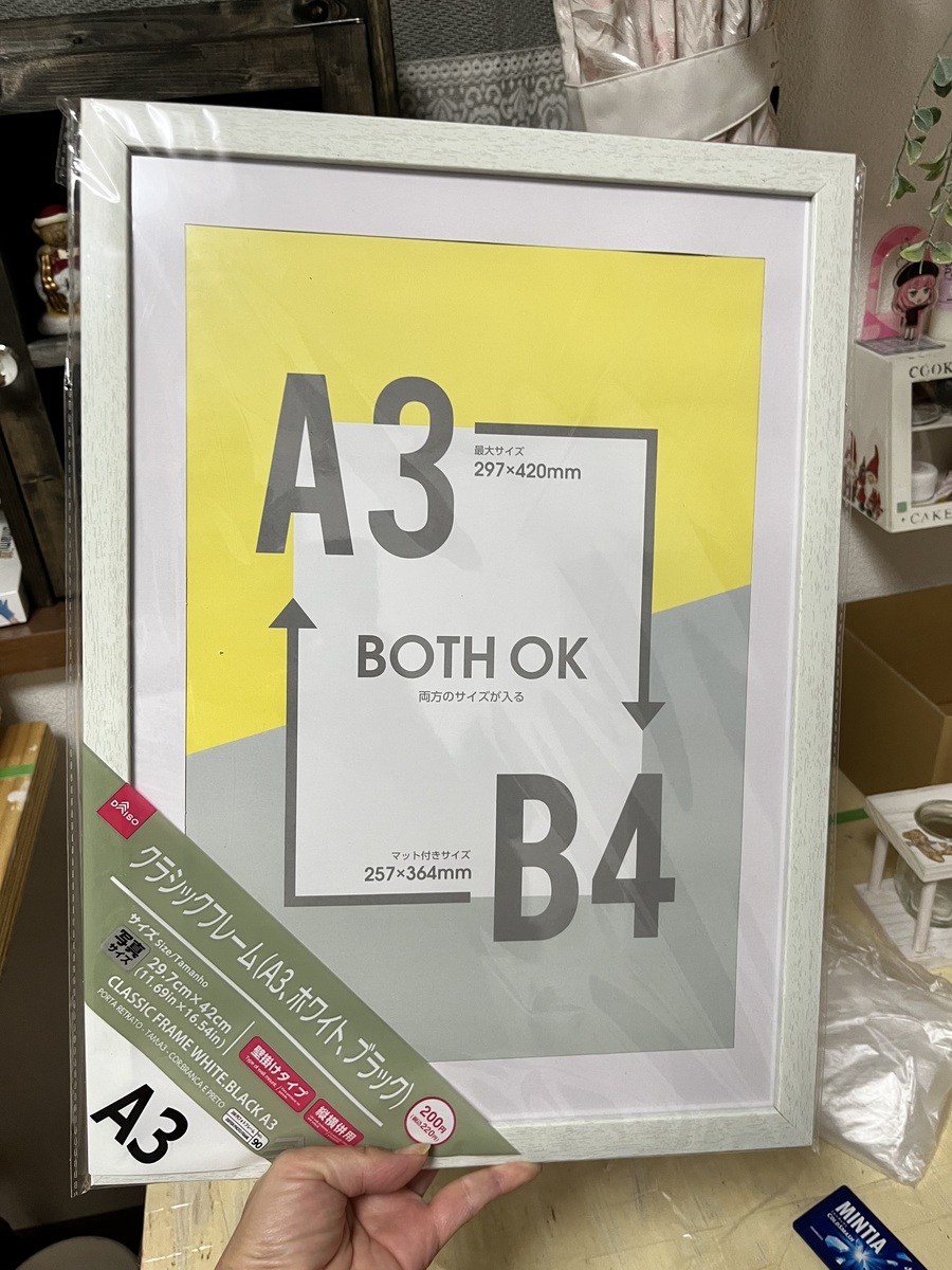 なのでダイソーで写真飾りフレームを買ってきてアクリルがジャストサイズだったので貼り付けました。