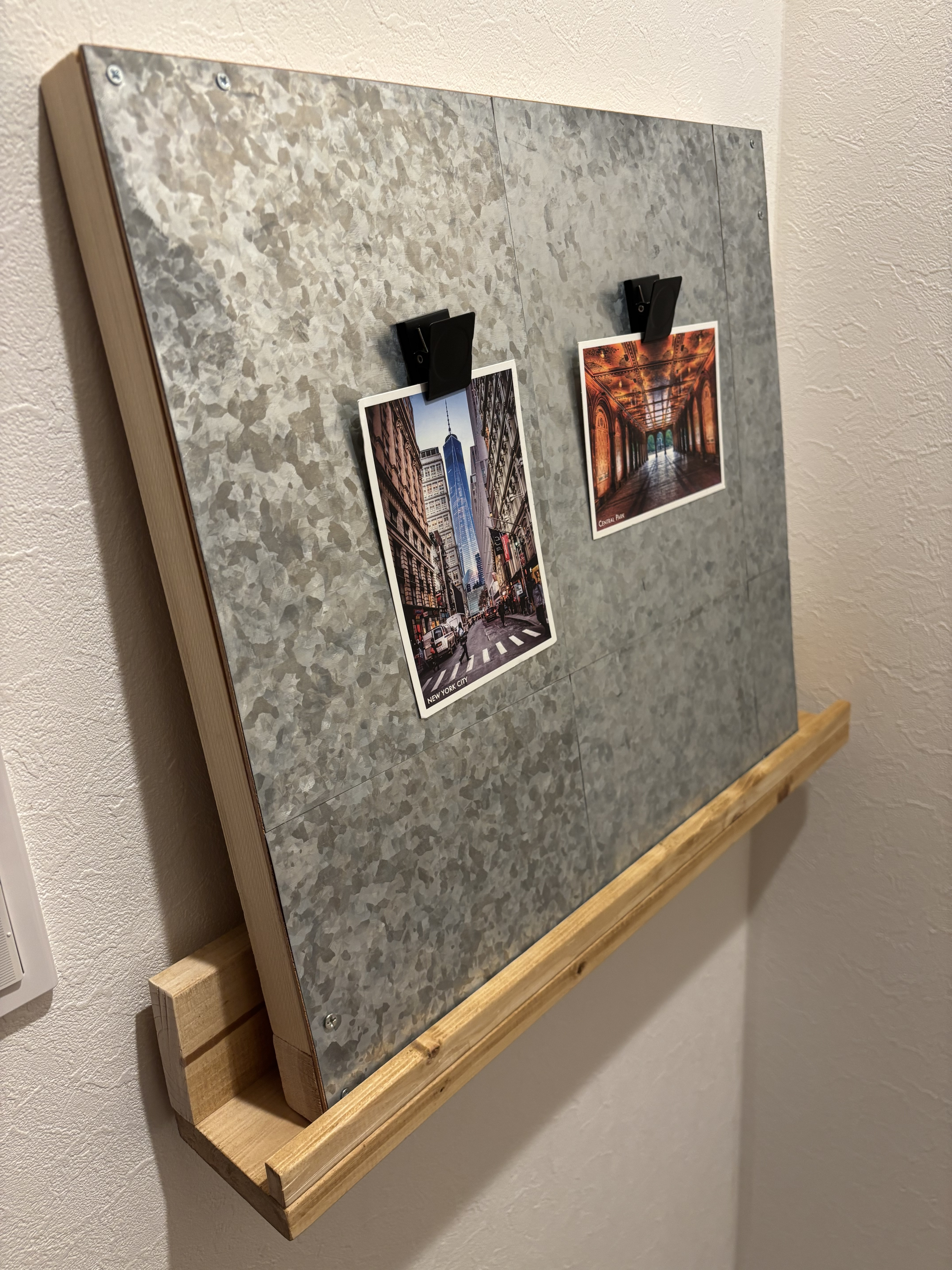 ブリキ板と薄いベニアと野縁という木材を使って作ってみました。マグネットで手紙など色々はれるし、なんか見た目もカッコ良い(^^)