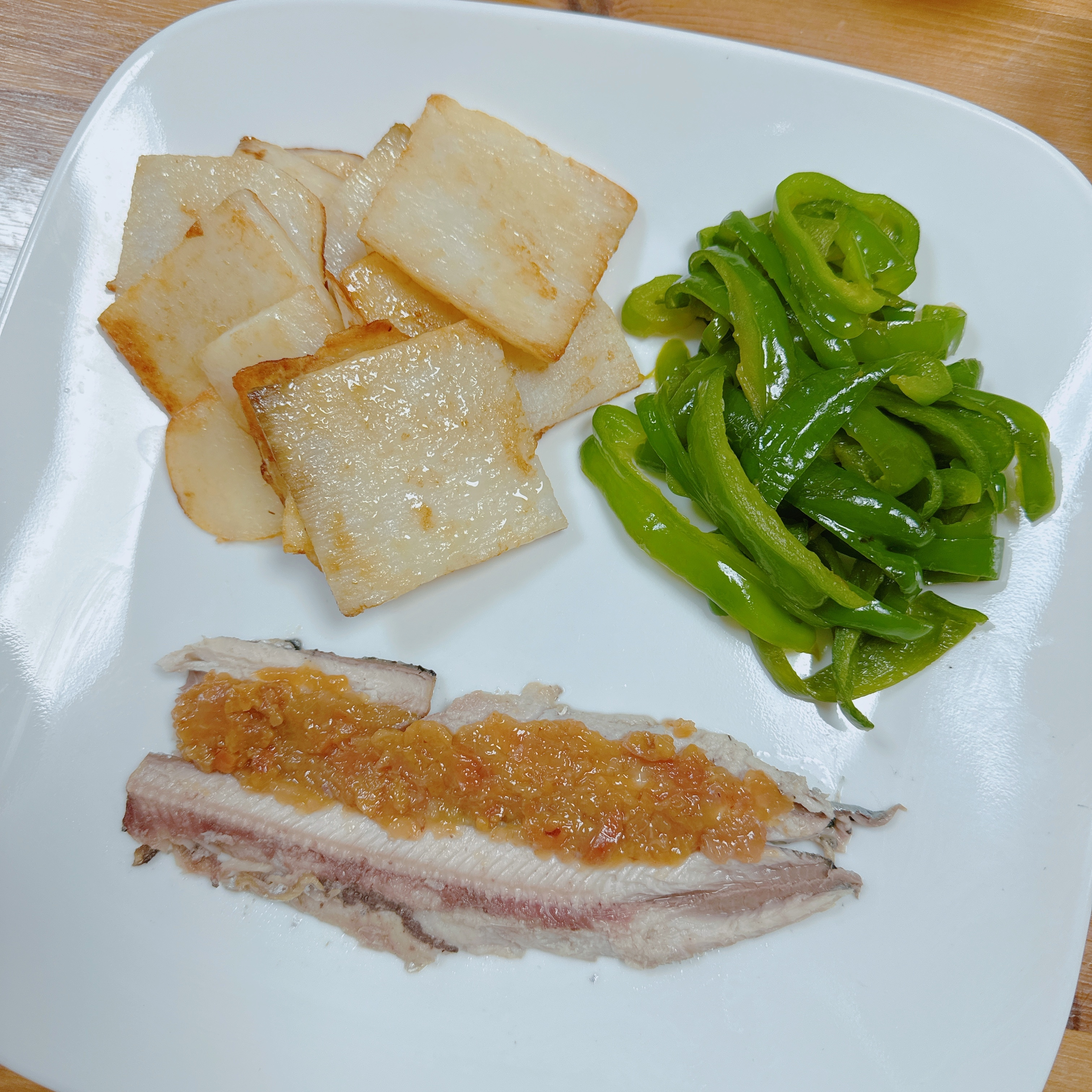 流行ってる、茹でさんま に、叩いた はちみつ梅を乗せたもの🐟 無限ピーマン出汁醤油味、長芋ステーキ。焼きさんまよる茹でさんまの方が好きかも‼️🤩