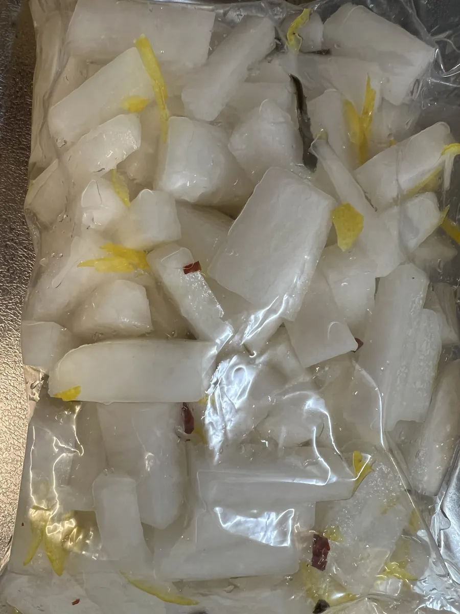 ③①の大根の水気を切り、ジップロックに入れて柚子の皮、鷹の爪、昆布を入れて浸かるくらいのかんたん酢を入れてチャックを閉じ冷蔵庫で1日置いたら出来上がり。