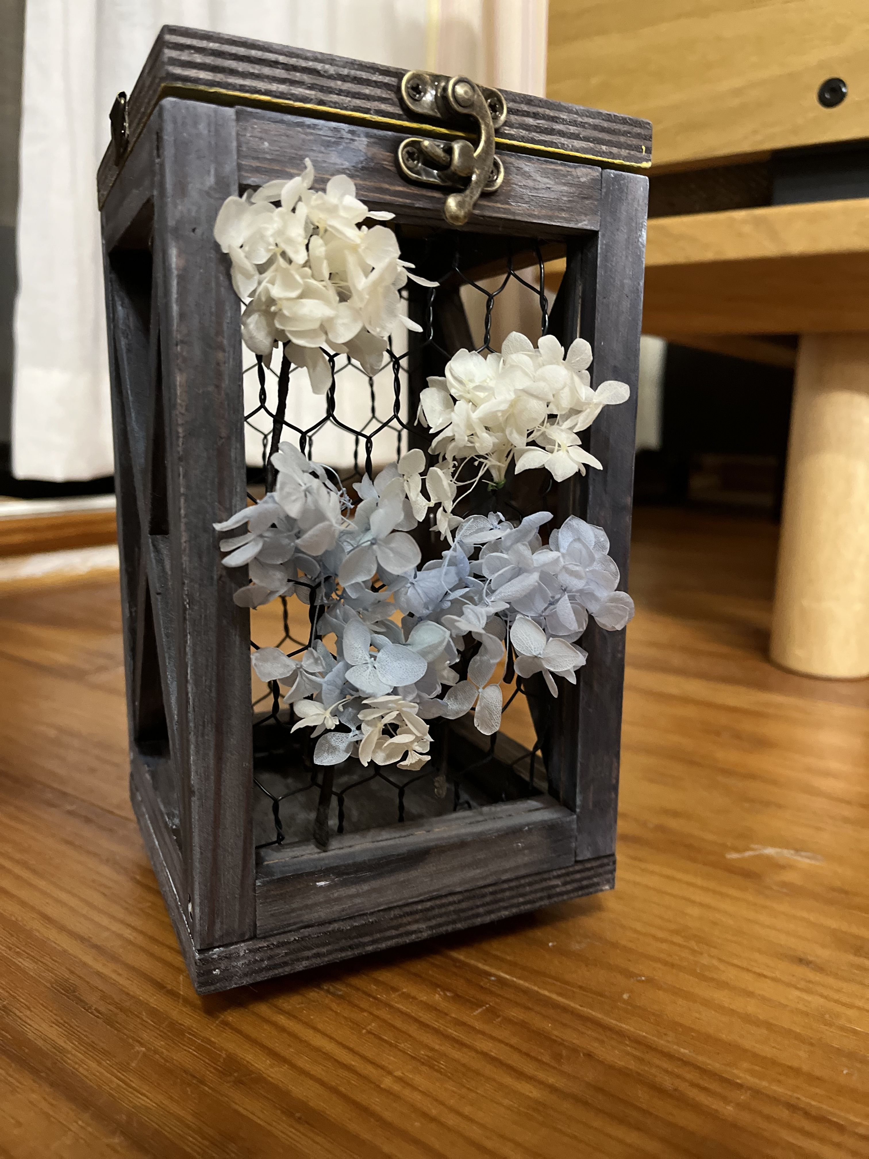 正面のチキンネットにはアジサイのプリザーブドフラワーをつけました。