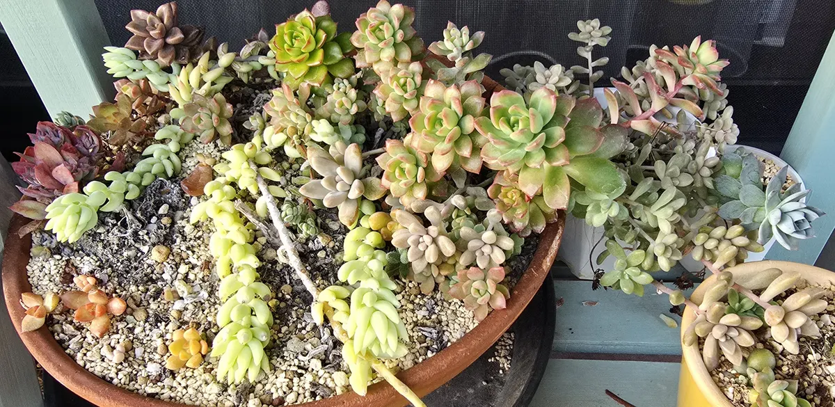 強風で飛ばされたり、ちょっと縮れちゃったりで、さみしくなってたので、ポンポン鉢で大きくなったコたちを加えて寄せ直してみました🎶