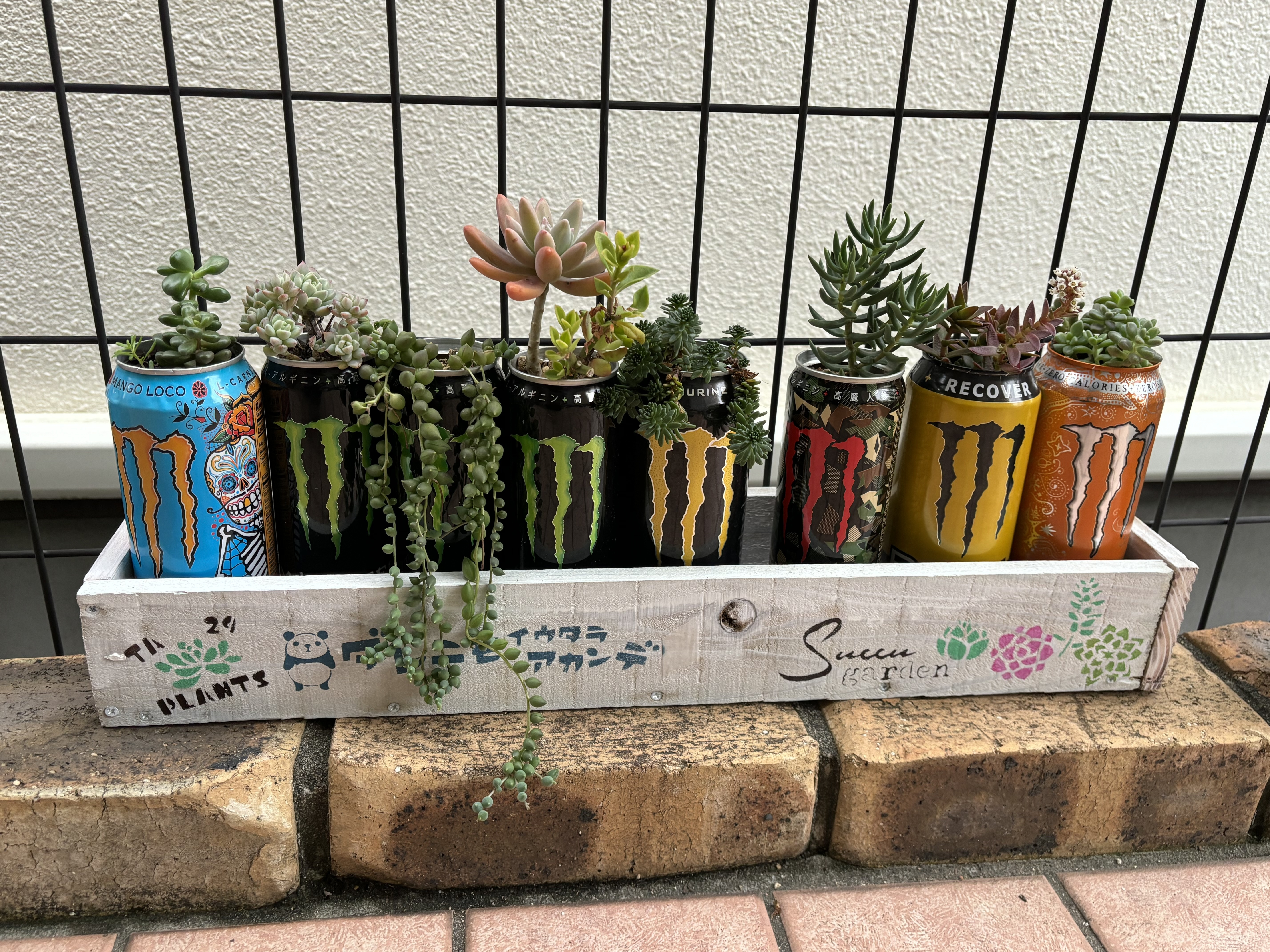トップ > グリーン > モンスター缶寄せの専用ウッドプランター 花*花 2023/11/11 20:52 モンスター缶寄せの専用ウッドプランター モンスター缶に寄せ植え☺️ たまたま日本で売られていない モンスタージュースを買う機会があって 缶の色もデザインも可愛くて たくさん買ってきました。 缶をみた時から 多肉植えて並べたら絶対可愛い〜と ひらめき🌟 しかし…並べてみたら 安定感ゼロ😱 すぐに倒れます そこで 専用のウッドプランターを作ろう❗️ ずいぶん前にそう思ったのですが なんとか形にすることができて よかったです😍 ぴったり収まった時は嬉しかったです〜 モンスター缶、可愛い缶がまだあります😍 時々入れ替えしたいと思います。 いいね 共有する 共有する X LINE リンクをコピー コメントする 4 件の返信 (新着順) ミュートしたユーザーの投稿です。 投稿を表示 Toko 2023/11/12 09:04 まとめて並べると見栄えもGOODですね。缶の模様も映えます。 なんとなく、不気味なモンスターの缶もこうすると素敵な模様に見えるから不思議❣️ いいね 返信する ミュートしたユーザーの投稿です。 投稿を表示 花*花 2023/11/12 17:19 Toko Tokoさん ありがとうございます😊そうなんです!たくさん並んでいると不気味さはなくなります(笑) いいね 返信する ミュートしたユーザーの投稿です。 投稿を表示 森の小さな工房 2023/11/12 08:38 育つの早そう~! \(^▽^)/ いいね 返信する ミュートしたユーザーの投稿です。 投稿を表示 花*花 2023/11/12 17:21 森の小さな工房 森の小さな工房さん それぞれのモリモリのグリーンをみたいです🥰 いいね 返信する ミュートしたユーザーの投稿です。 投稿を表示 みんと 2023/11/12 07:32 花*花さん、箱ってなにげに難しいですよね。 ちゃんと水はけ用の穴まで開いて、カワイイステンシルまで✨素敵〜💕 いいね 返信する ミュートしたユーザーの投稿です。 投稿を表示 花*花 2023/11/12 17:26 みんと みんとさん よぉくみると👀わかるのですが(笑)置きたい場所を測ってノコギリカット🪚ところが…両端の板厚分計算していなくて、仕方なく片方は板を中に収めました😅 いいね 返信する ミュートしたユーザーの投稿です。 投稿を表示 みんと 2023/11/12 18:42 花*花 ホントだ!ぷぷっ😆 これもまたDIYの楽しいところ🎵 いいね 返信する ミュートしたユーザーの投稿です。 投稿を表示 おーくみ 2023/11/12 02:53 これなら倒れないですね😊🎶🎶 並べると可愛い❤️ いいね 返信する ミュートしたユーザーの投稿です。 投稿を表示 花*花 2023/11/12 17:28 おーくみ おーくみさん はい、これならバッチリです☆:.。. o(≧▽≦)o .。.:☆倒しては植え直し繰り返しました(笑) いいね 返信する