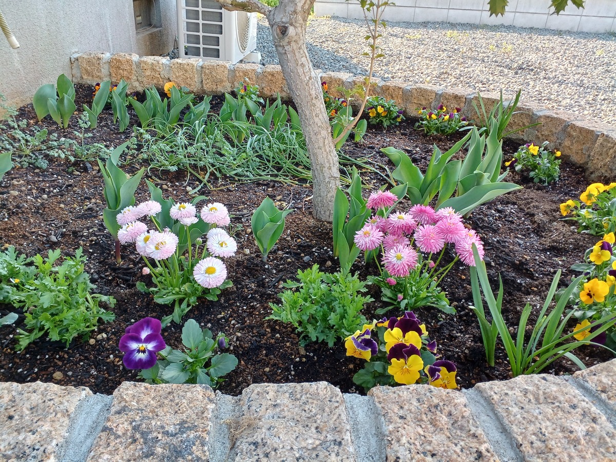 ピンクのデイジーの後ろはピンクのチューリップが咲く予定💗