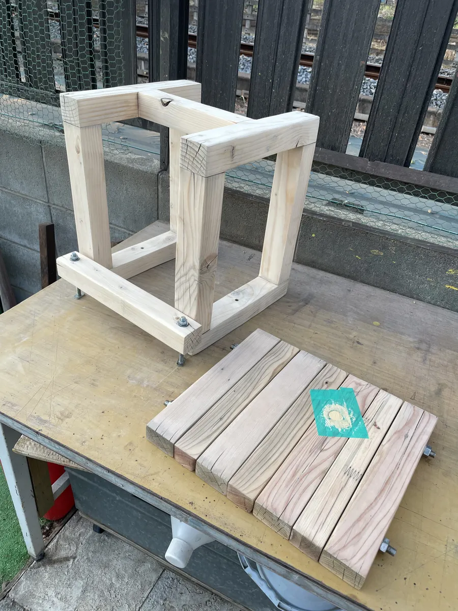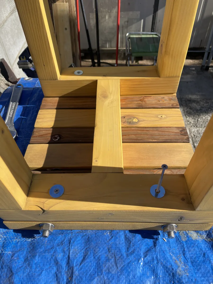 ↓天板の組立てでは、角材の間にワッシャーを咬ます事にしました。通気を考えて計12枚。