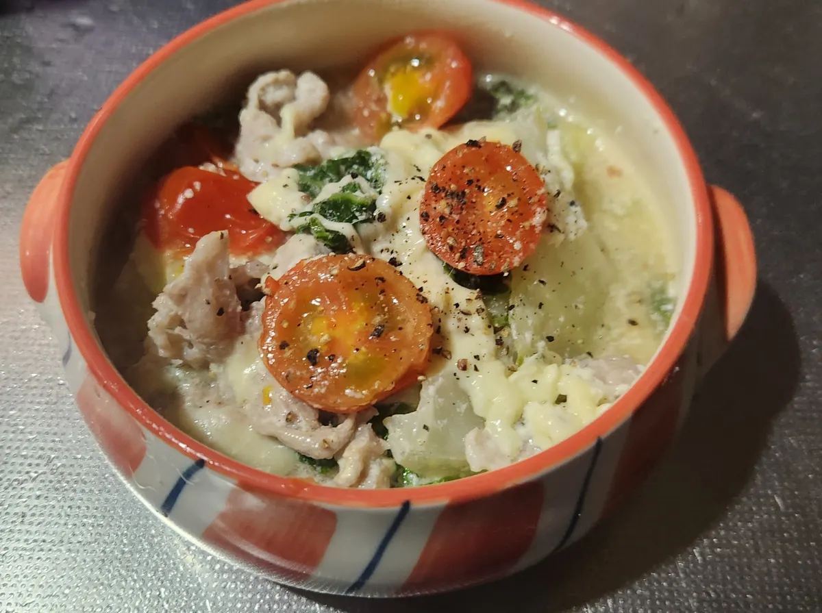 投稿を表示白菜と豚肉にチーズでコクがある所にトマトが入ることで酸味も加わり