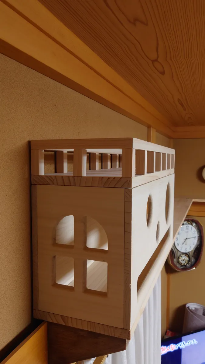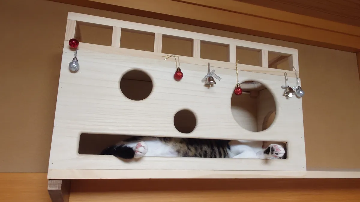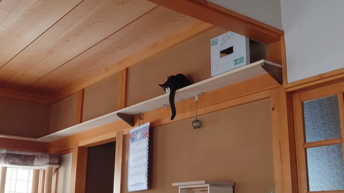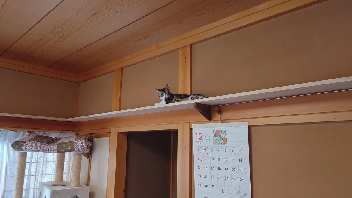 投稿を表示きちっとした仕事ぶりで感心しました。また猫ちゃんへの愛情の入れ方が伝わってきますす。キャットウォークを部屋の長押(なげし)に張り巡らせ猫ちゃんも嬉しいでしょうね、見張り台も立派です。ここでくつろぎながら家族を見張っているのでしょう😺。