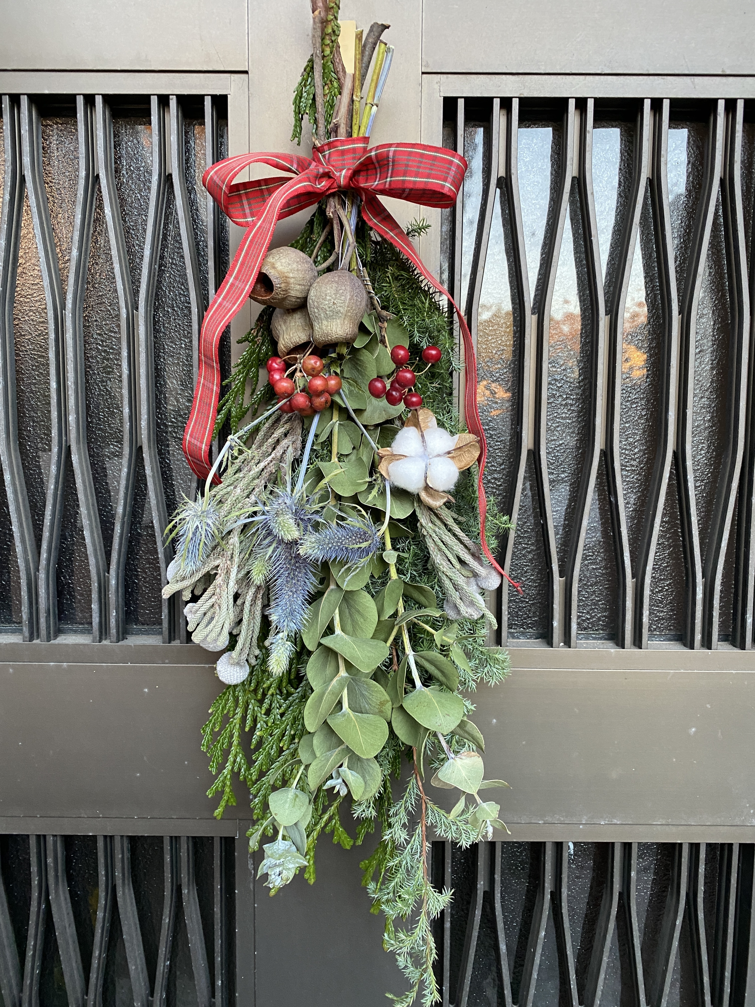 クリスマス用のスワッグを作って早速玄関に飾りました。リースを作るのには、自信もないし、時間もないので、今年はこれでクリスマスを迎えます。