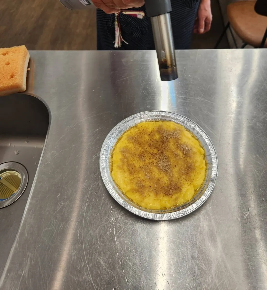 カタラーナは殆どお鍋で混ぜながら加熱で出来上がり、耐熱皿に移して粗熱が取れたらてんさい糖をふりかけバーナで炙りましたがバーナを使うのは初めてでしたが楽しかったです😉💕🎵