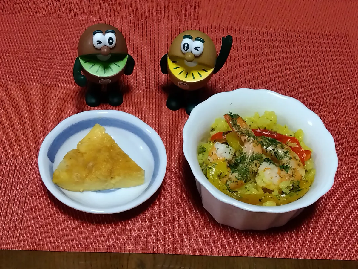 今日の夕食に家族とパエリアとカタラーナにスープとフルーツ、酢の物で食べました😋💕🎵