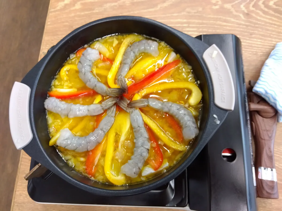 パエリアはレンジで楽ちんパンを使ってお米をレンジ600wで4分加熱し具材とエビ、パプリカをバランスよく並べてから600wで17分で出来上がりです