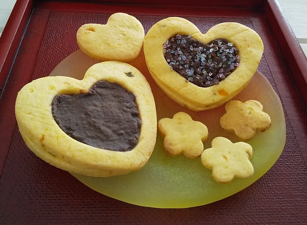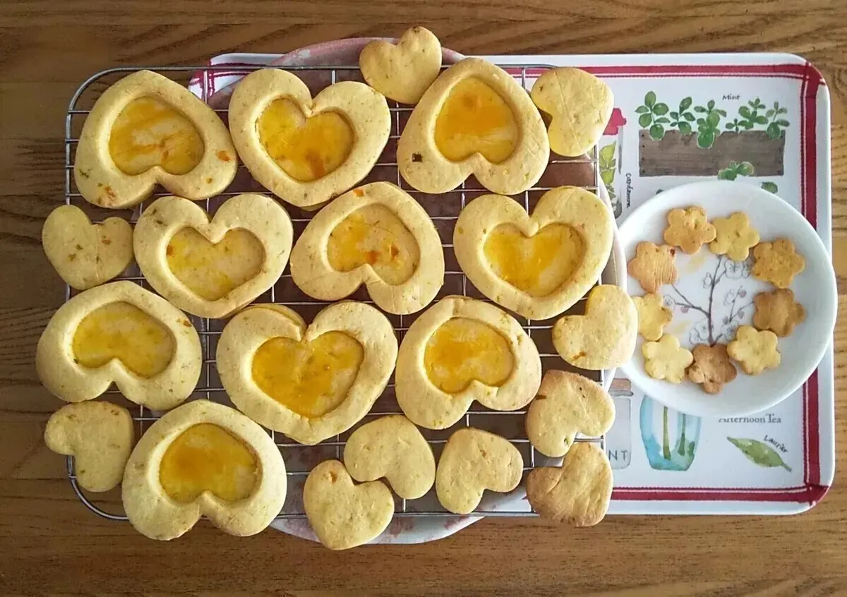 ⑤ハートの型抜きで、ハートと、ハート小でくり抜いた2種類の生地を作る ⑥ハートに卵黄を塗り、上にハート小をくり抜いた生地を乗せる ⑦160℃のオーブンで、18分焼く (くり抜きで出た小さな🧡と、余り生地の🌸も一緒に焼き、15分で取り出す) ⑧焼き上がったら、網に乗せ冷ます |