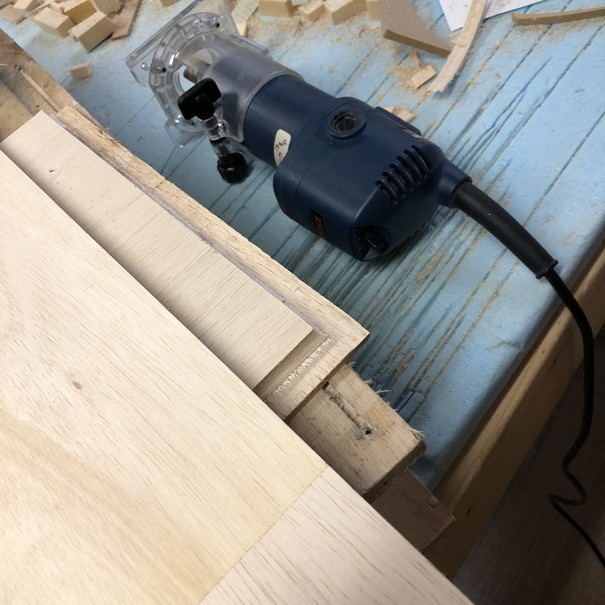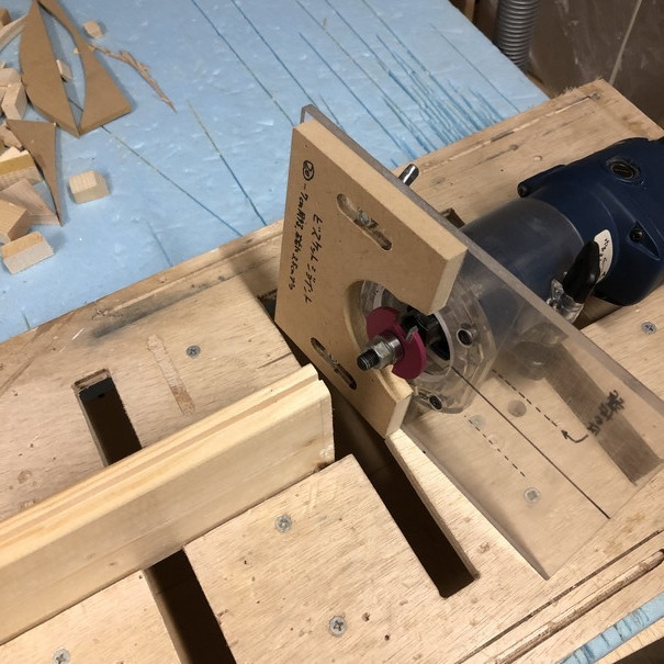 MDF板のガイドに添いながら、トリマーで彫っていきます。