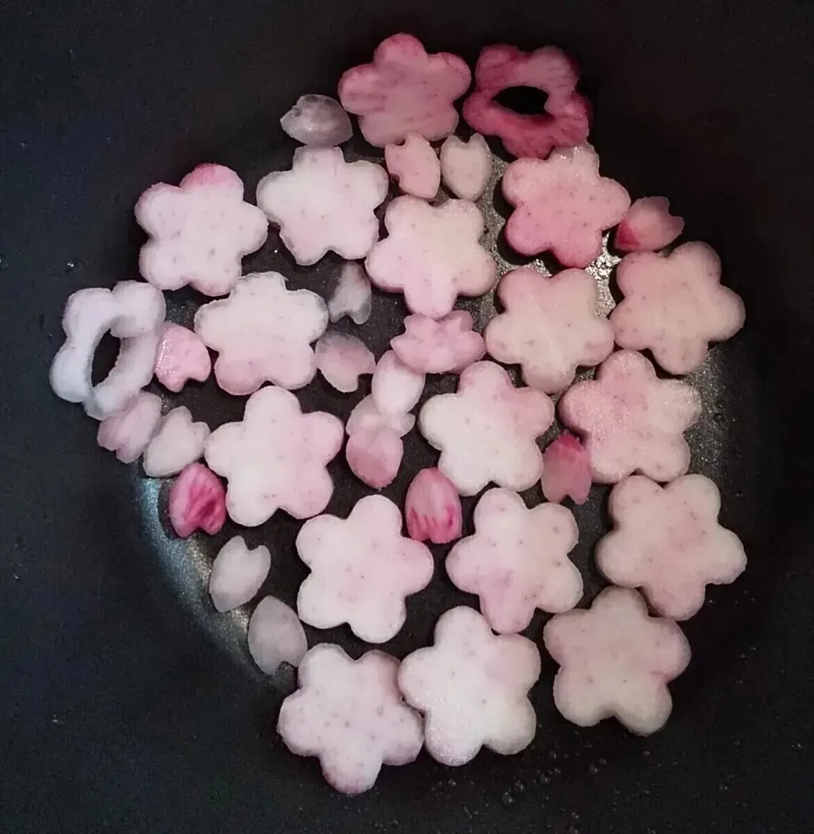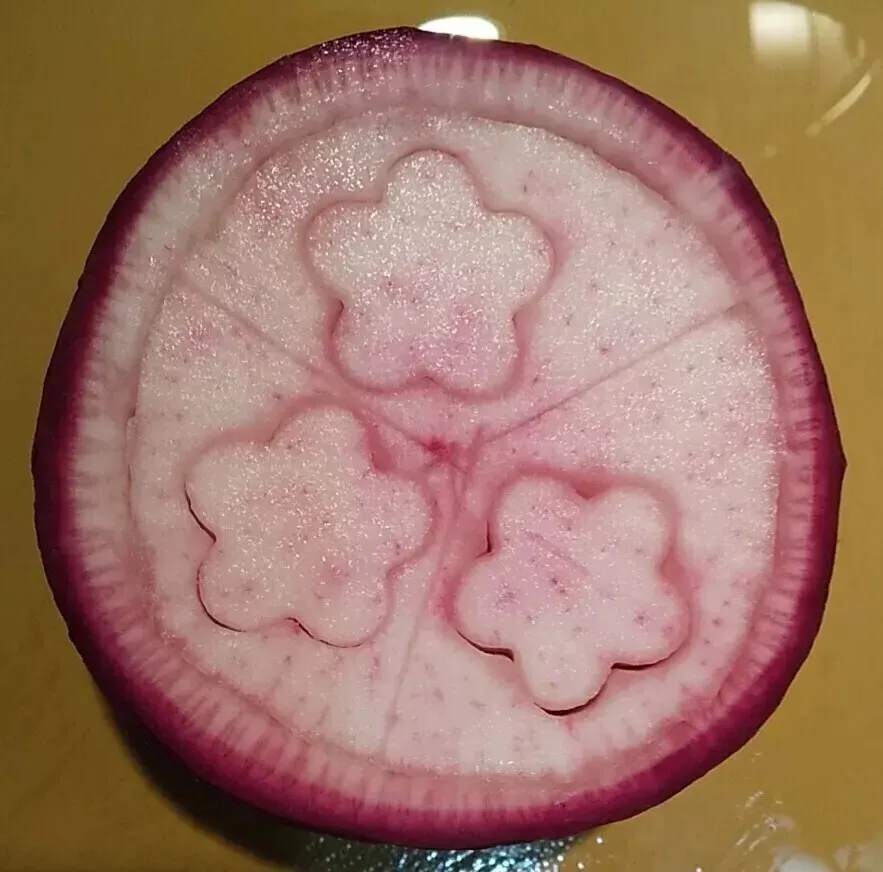 投稿を表示お花型のくり抜きがピンク色で可愛いですね🩷赤蕪の自然の色ってところもポイント高いです☺️👏