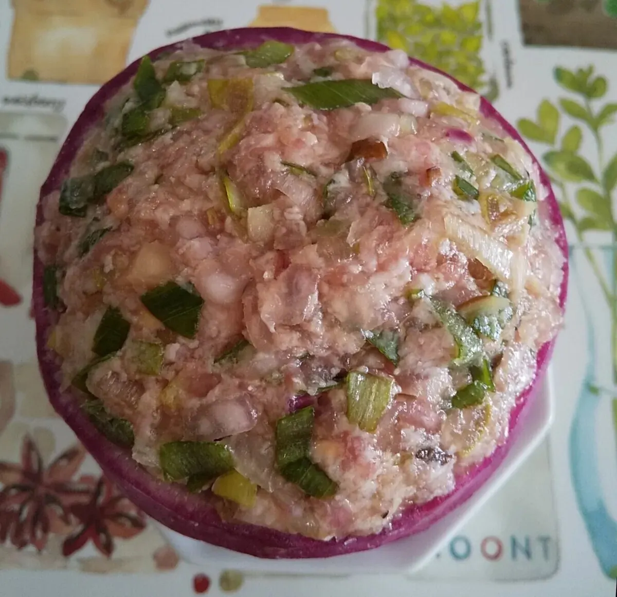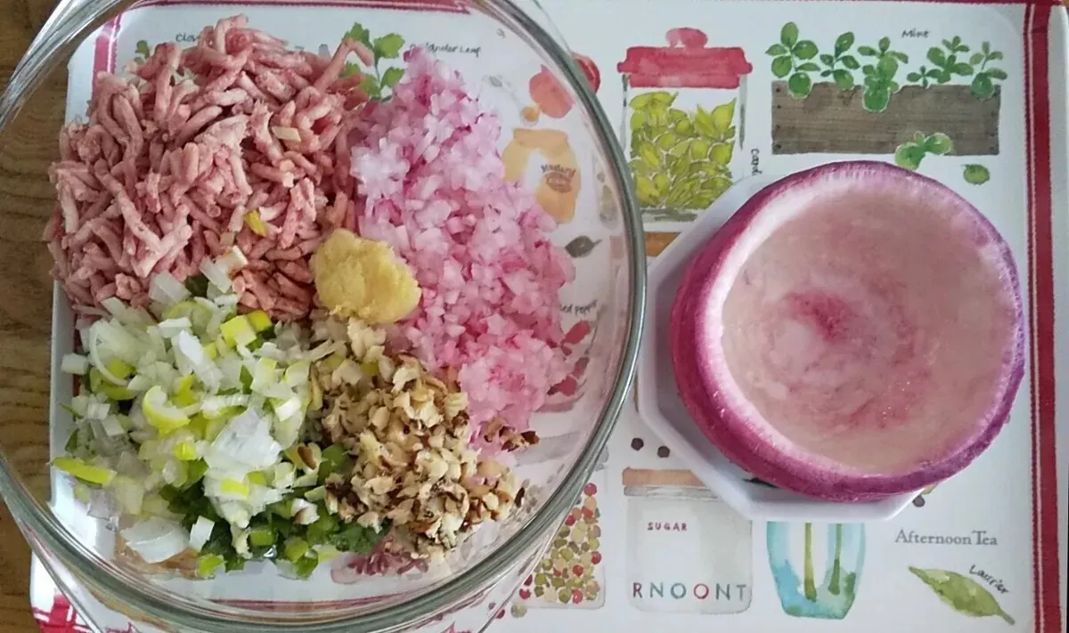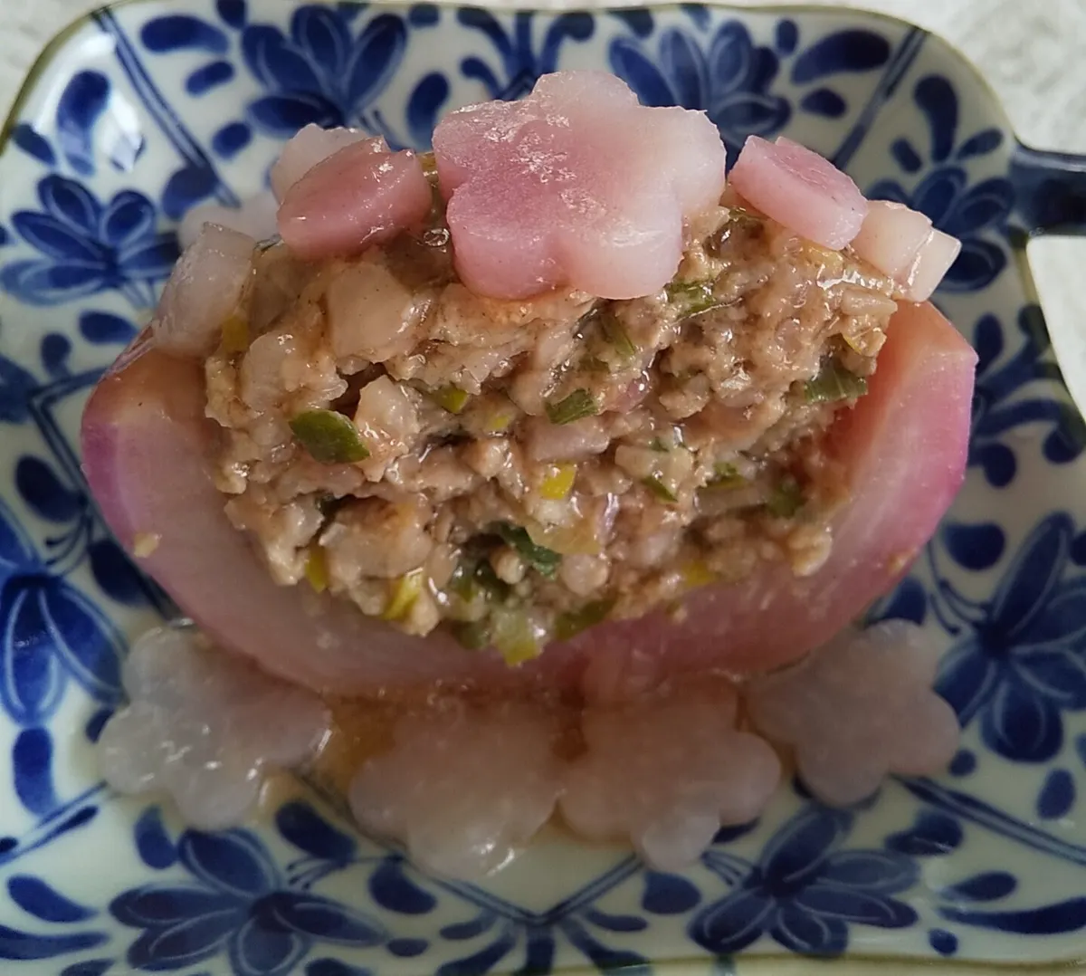 お正月のお野菜福袋に入っていた赤蕪を使い、花飾りでお正月ぽい、肉詰めを作ってみました💮