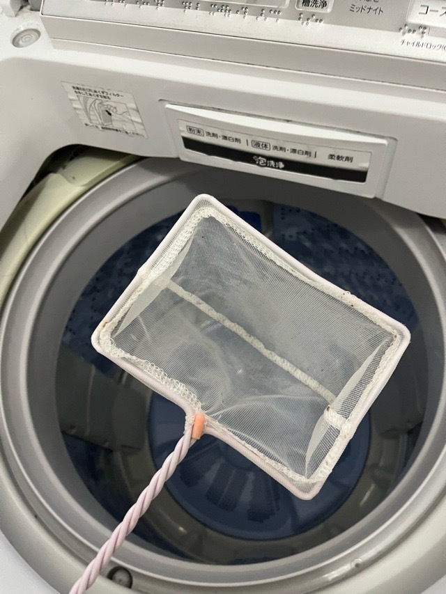 すすぎをして脱水する為に全部水を流さないで少し残っている状態でフタを開けてネットを使ってカビを取ると最後の掃除がしやすいと思います。