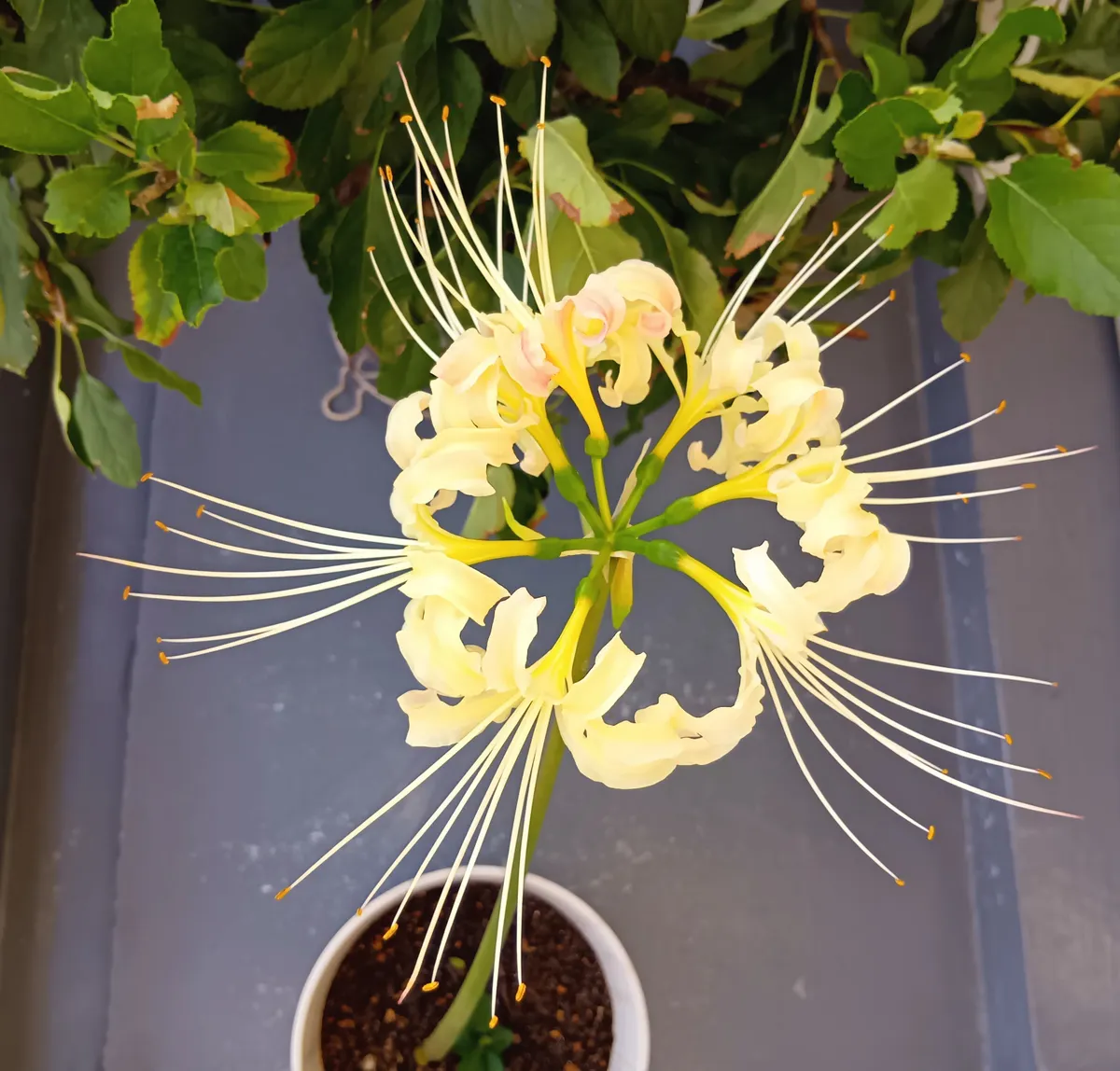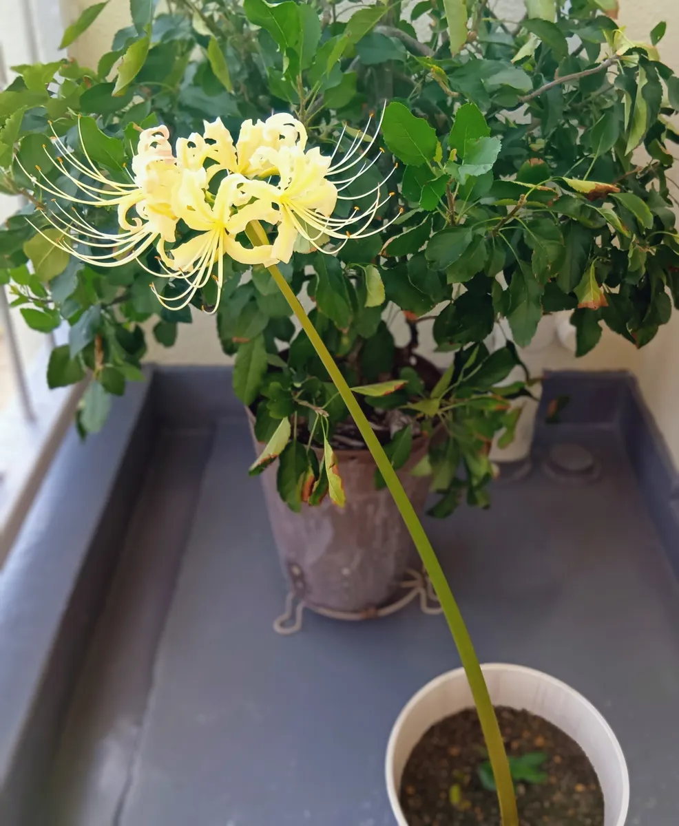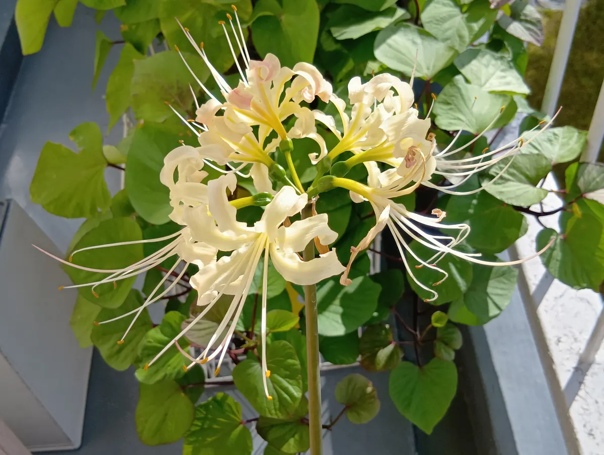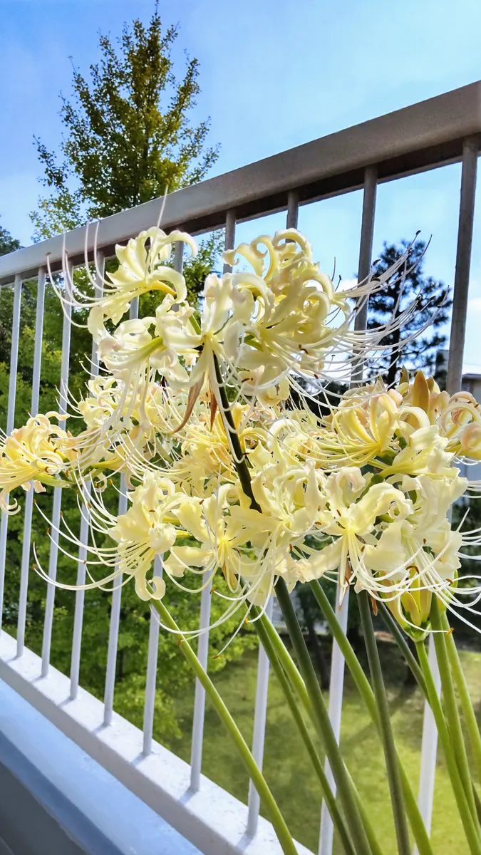 白い彼岸花が咲きました。厳密には少し黄色味のあるクリーム色かな。たまーに赤い筋が入ります。先祖返りしてるのかもしれません。でも綺麗です✨