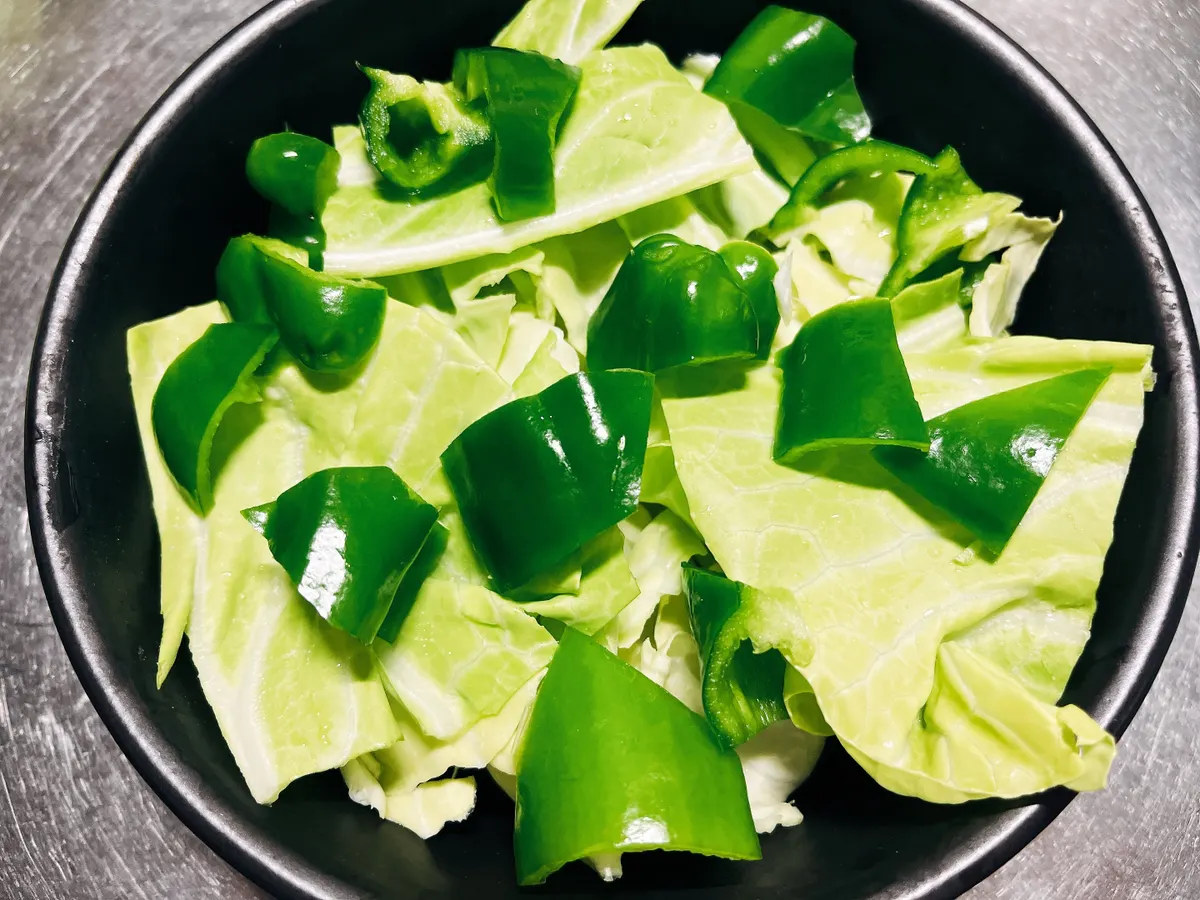 キャベツ、ピーマンをカットし深皿のプレートに1/3程度入れます。