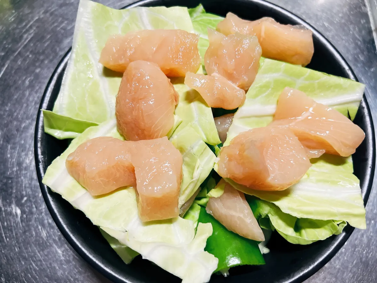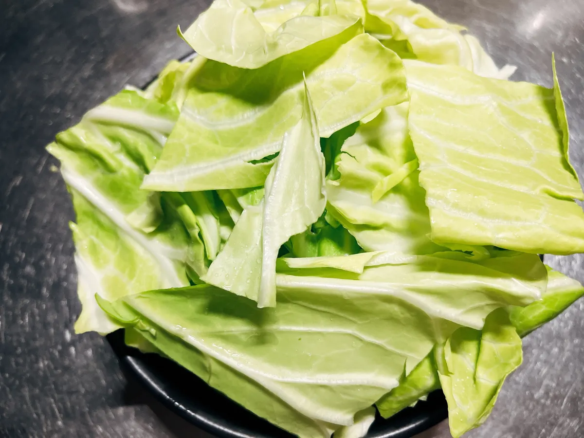 ささみをひとくちサイズにカットし、キャベツの上に半分のせます。