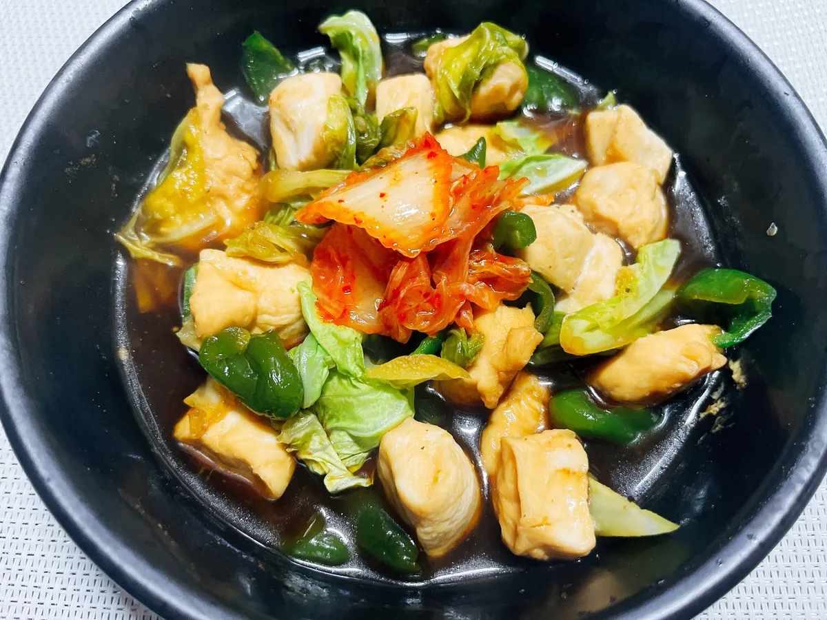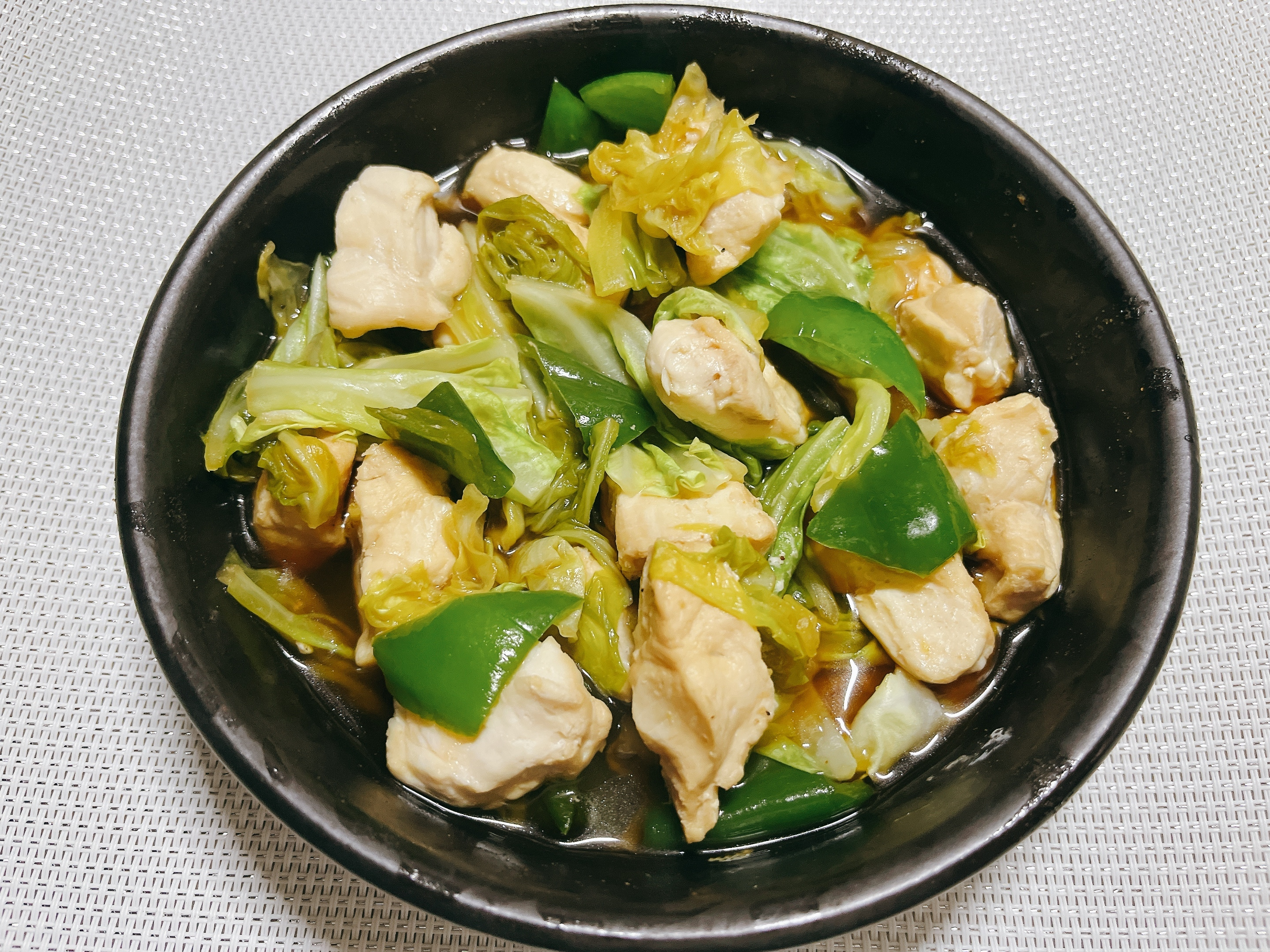 焼肉のタレと料理酒を回しかけて、キャベツで蓋をするようにささみを覆います。
