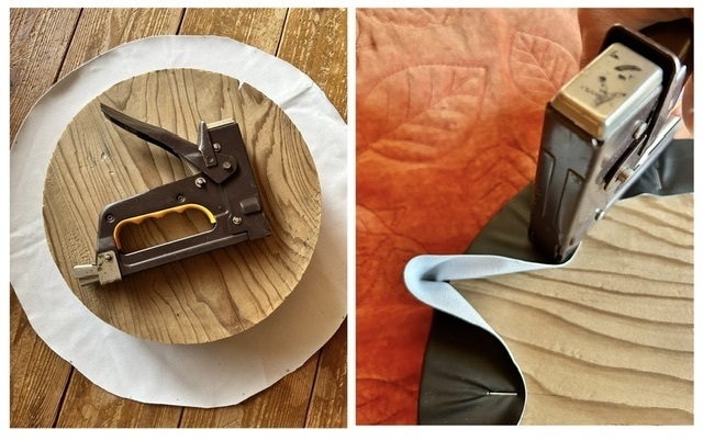 ハギレの上に置いて押さえながらガンタッカーで止めていくと