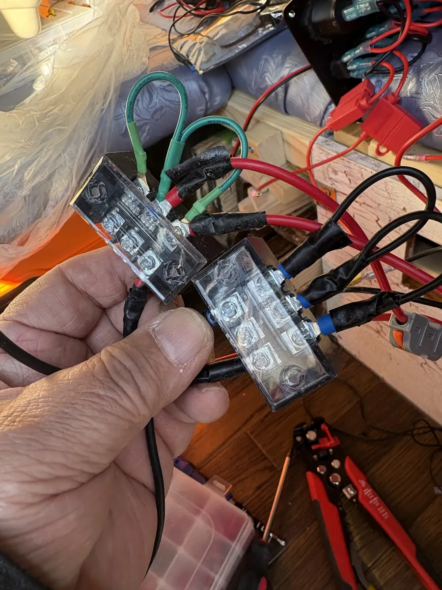 配線見直し、先ずは怪しいのはマイナス分配・・・・電気来ていない点検棒で確認分配手前までは来ている。ならば分配で点検集合部分に来ていないという事は圧着不備・・・見直し集合部分の真ん中が通電していないここを修正点灯、点かない?