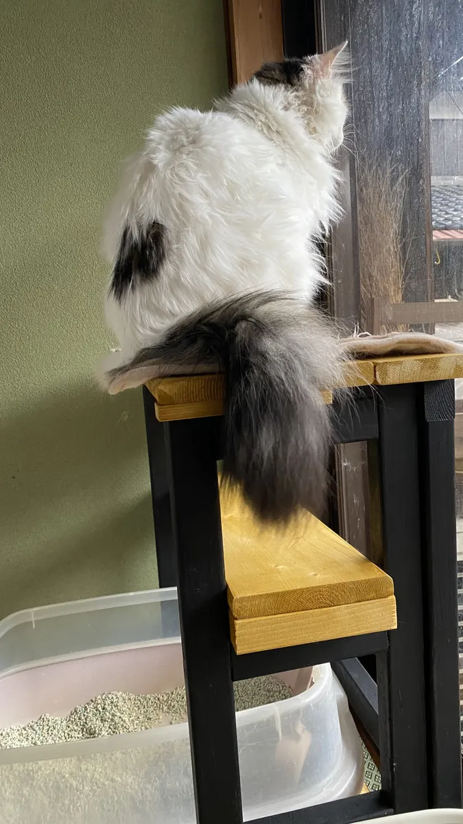 翌日、猫さまのトイレ上の棚にしたら、乗ってくださいました😽