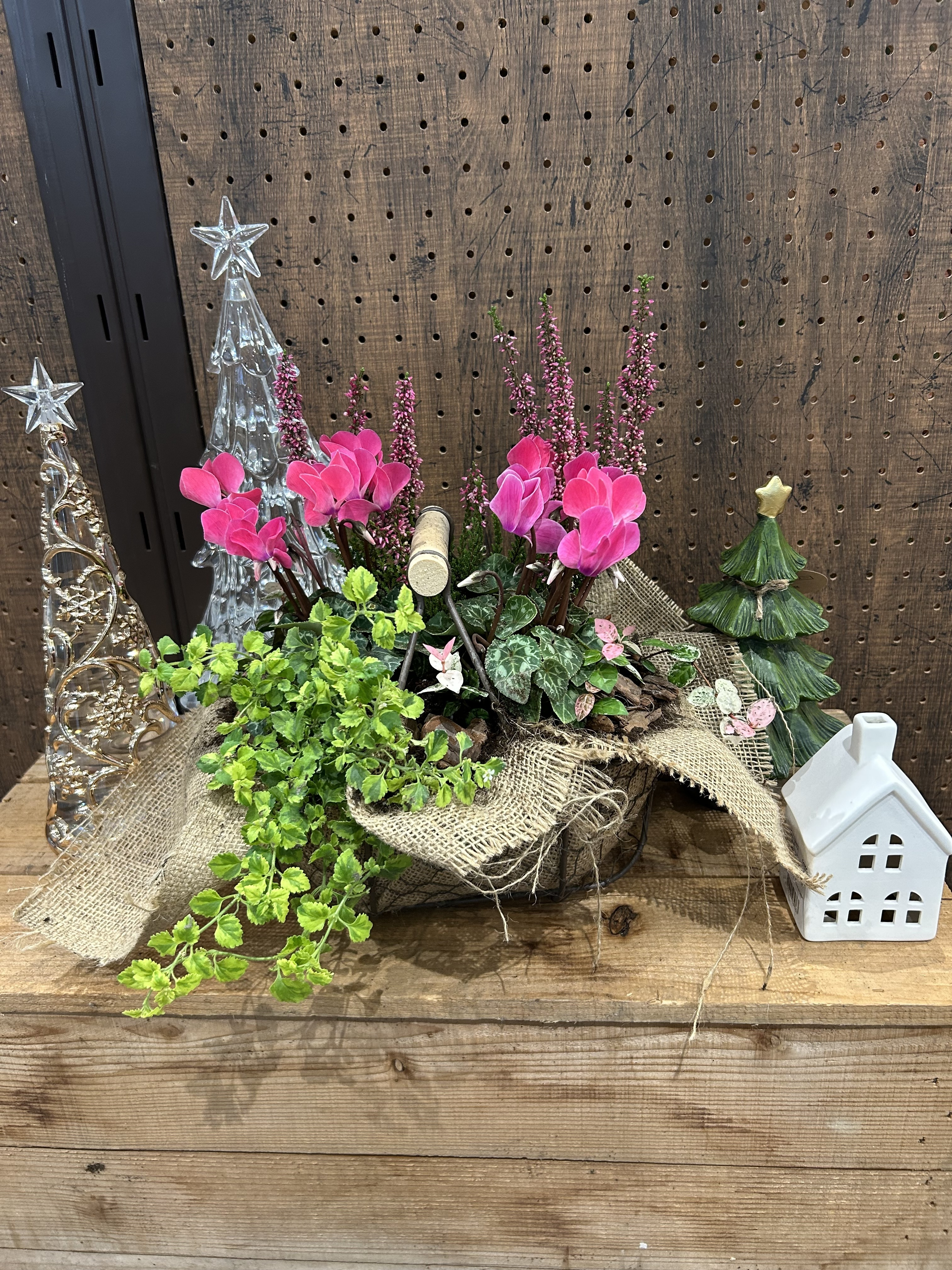カゴ🧺、ほんと、実物見たら小さくて、シクラメンを入れたり出したりしながら植え込みました