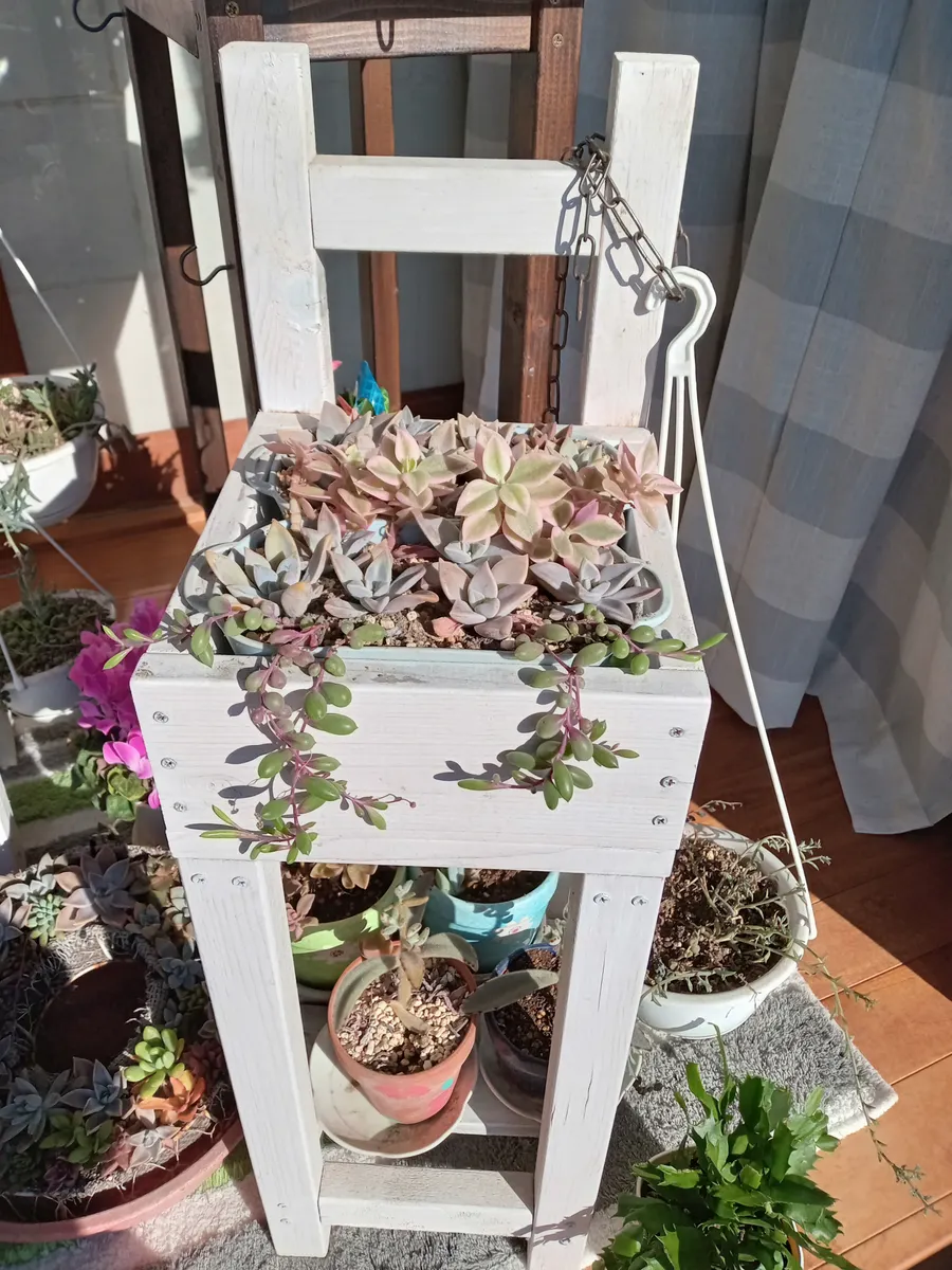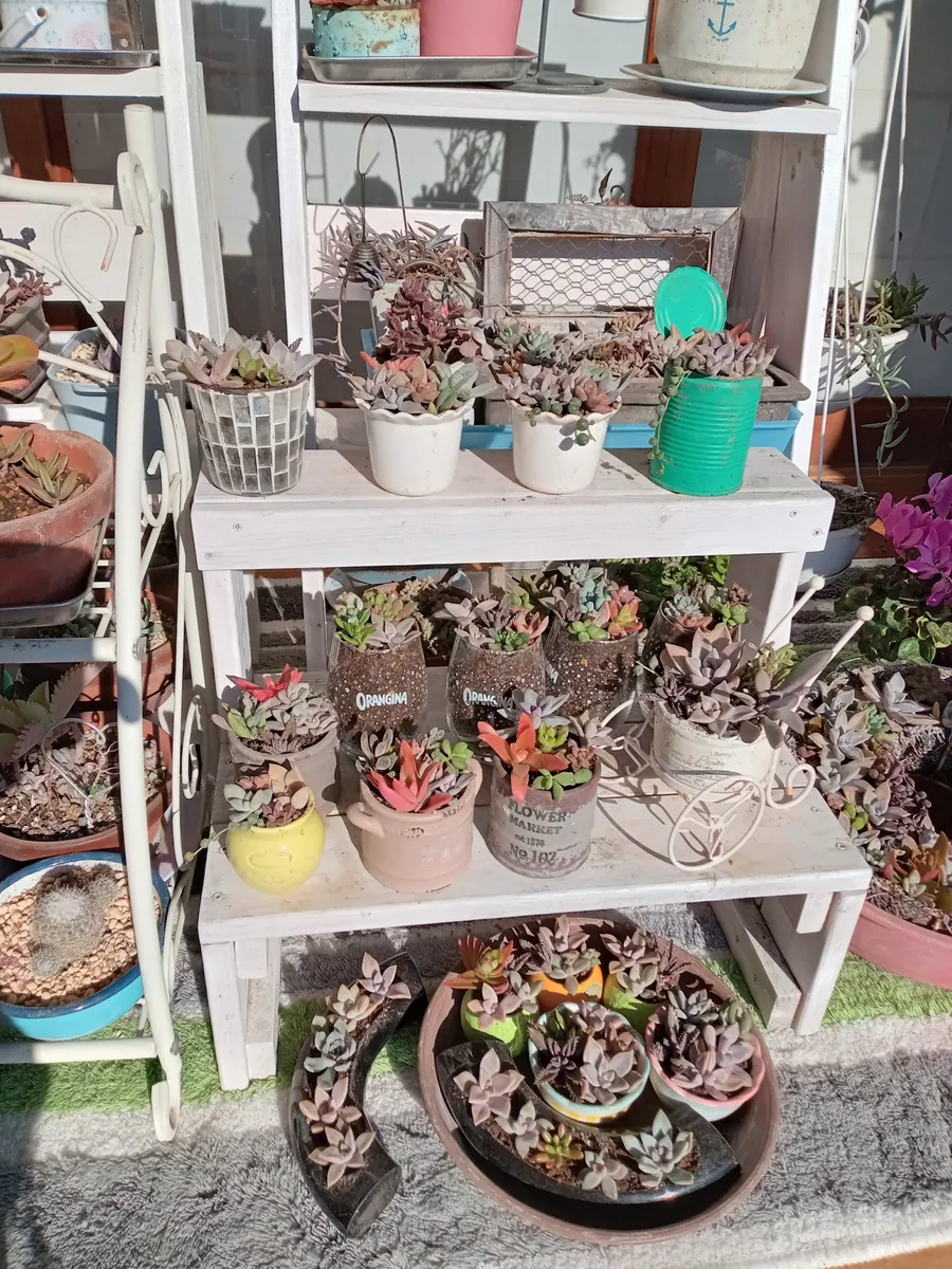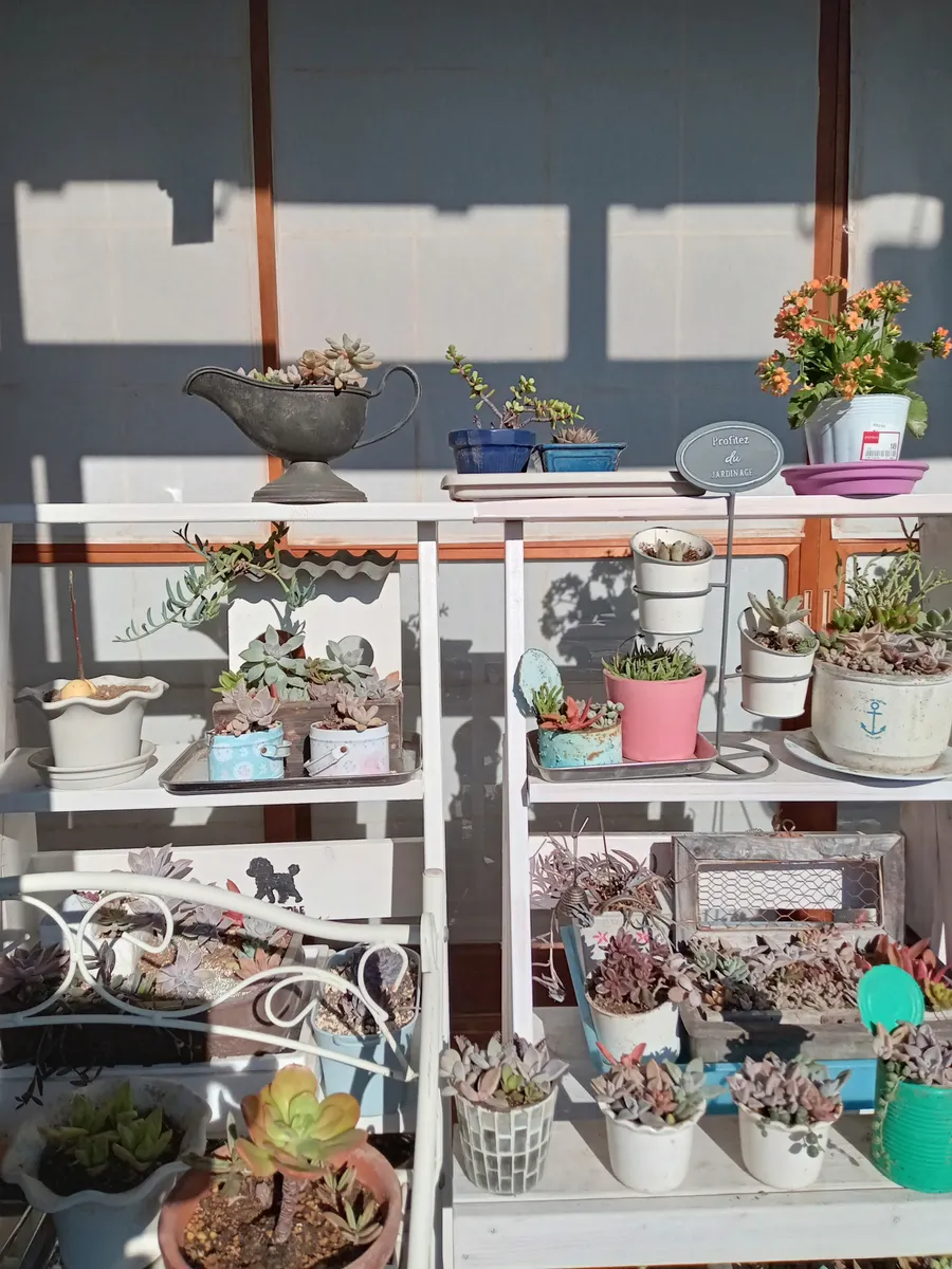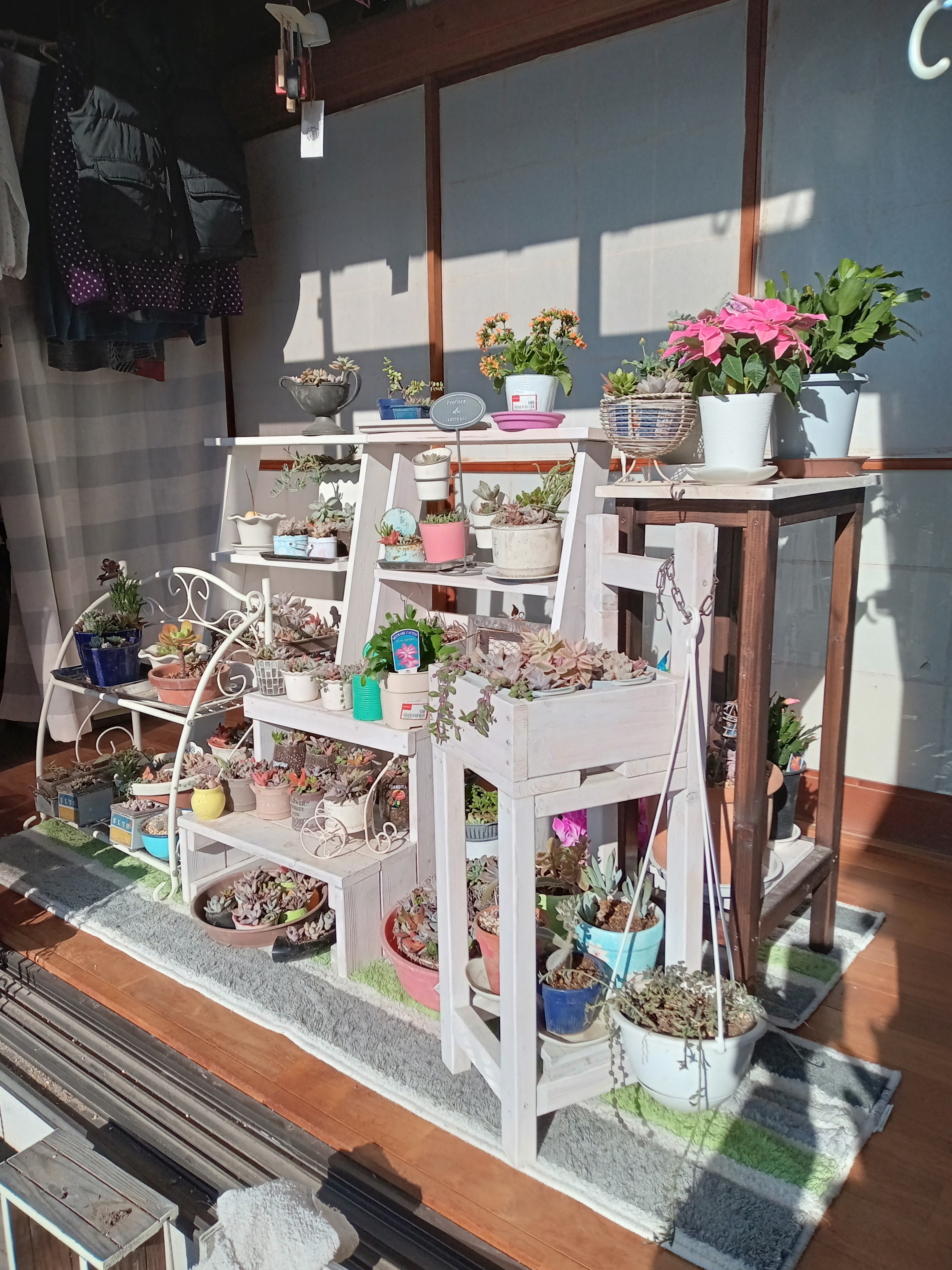 投稿を表示最高の場所ですね😊WS作品も飾りやすい棚とかあって良いですよね。左上にある、カレー入れるような器に植えてるの可愛いですね。本当の器?器に似せた鉢?色んな器で楽しめるのもいいんですよね〜😃
