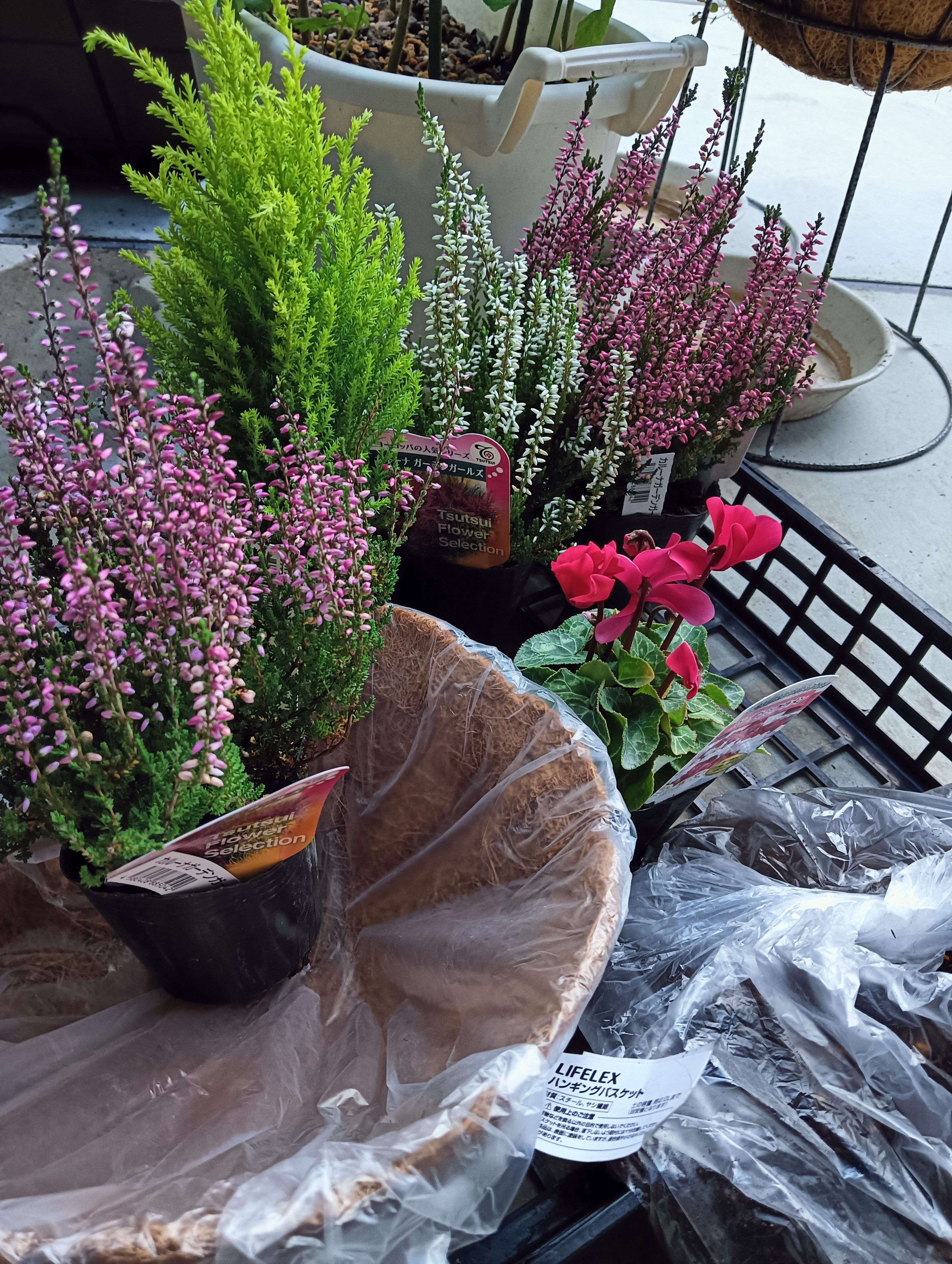 以前植えてたカルーナが消えてしまったので、今回3色とゴールデンクレスト、シクラメンです。土とビニール手袋も。