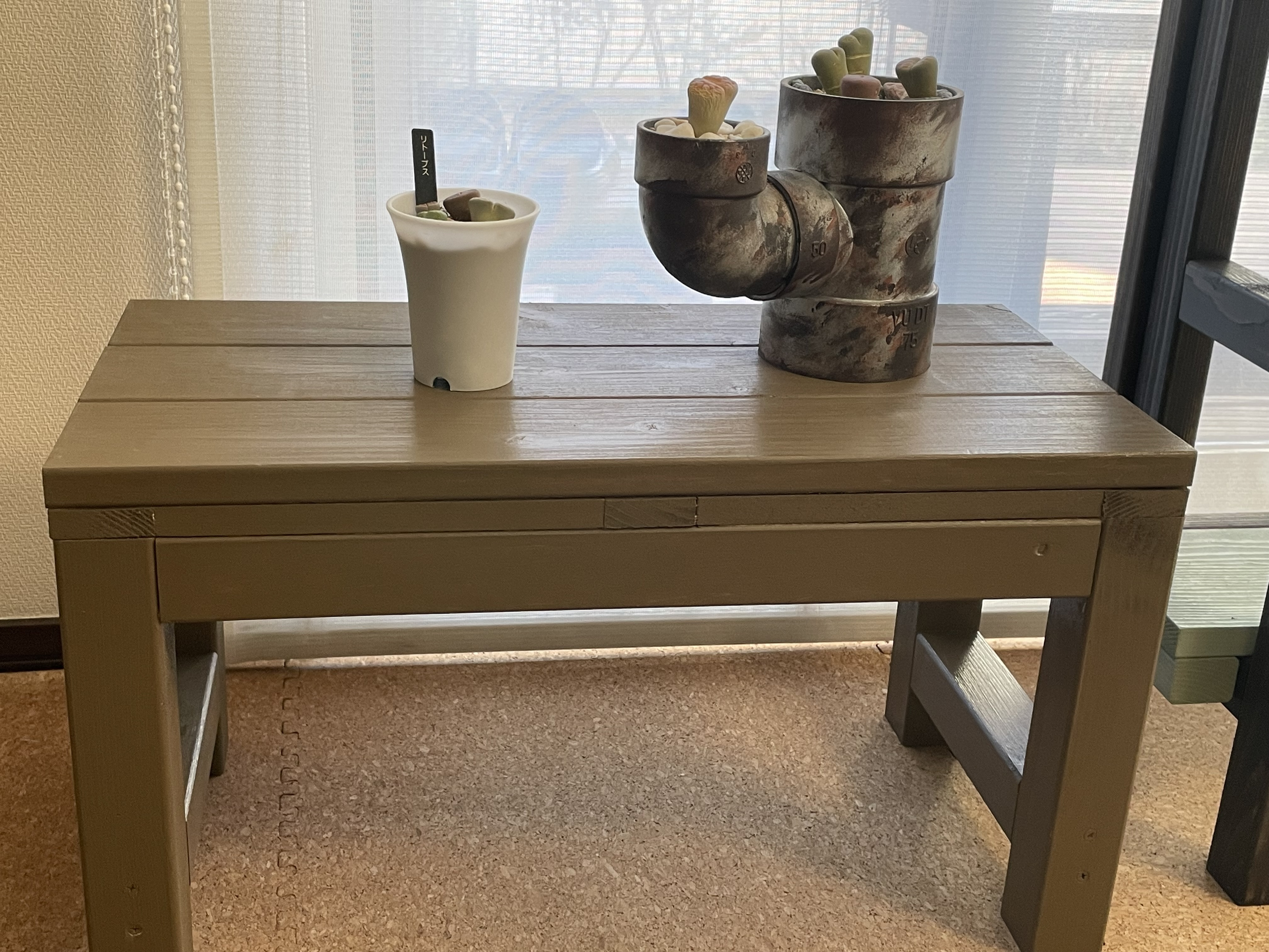 ミニロングチェア以上に目立つ存在があって😅ビニール缶?!の多肉植物