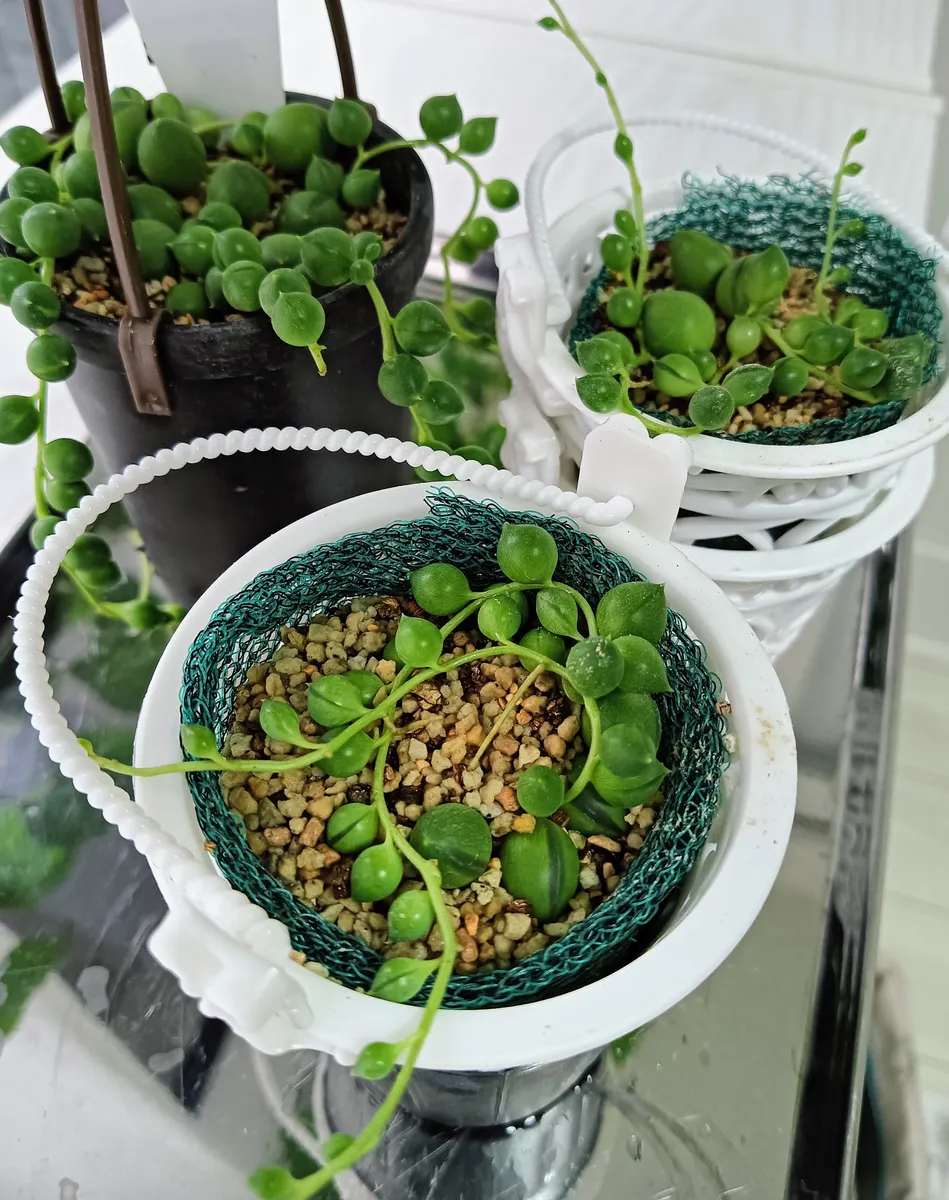 持ち帰り、吊り鉢(インテリアポット)に植え替えました。それぞれに立派な根っこがあり、🏡の環境に馴染んでくれると良いなと思います。今は植え替え直後なので、室内置きです。S字フックを付けてるので、安定の為に鉢を重ねています。早く連結で飾りたいです。我が家に居付いてくれますように🙏🙏🙏🙏 🙇