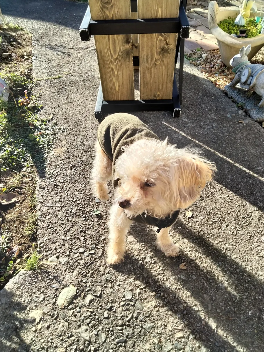 ルルちゃん朝〜お付き合いありがとう…お庭に出たばかり寒かっけど終わりは少し暖かに…さぁ中で朝ごはん食べようね🥐☕🫙( パパちゃんは既にゴルフ🏌️出発)