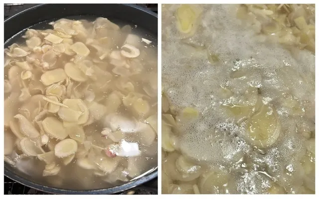 ③水を加え中火に掛けると、あくが出るのでそれを取ったら沸騰しない程度の火加減で30分煮出します。