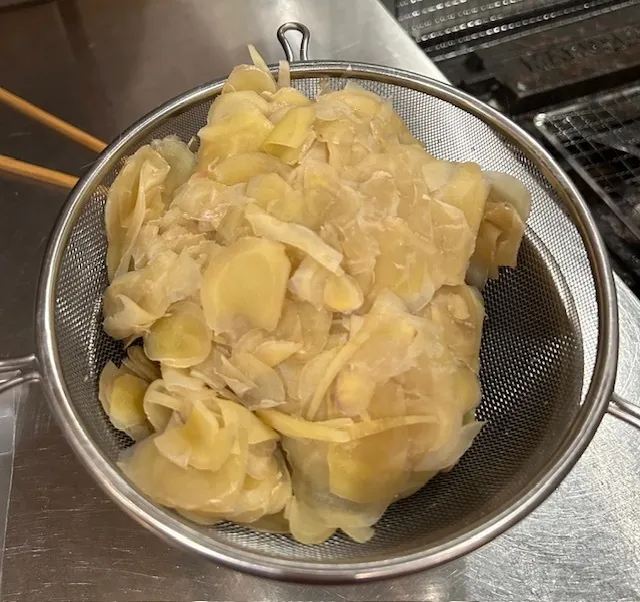 ①新生姜は皮付きのまま丁寧に洗い、薄い輪切りにします