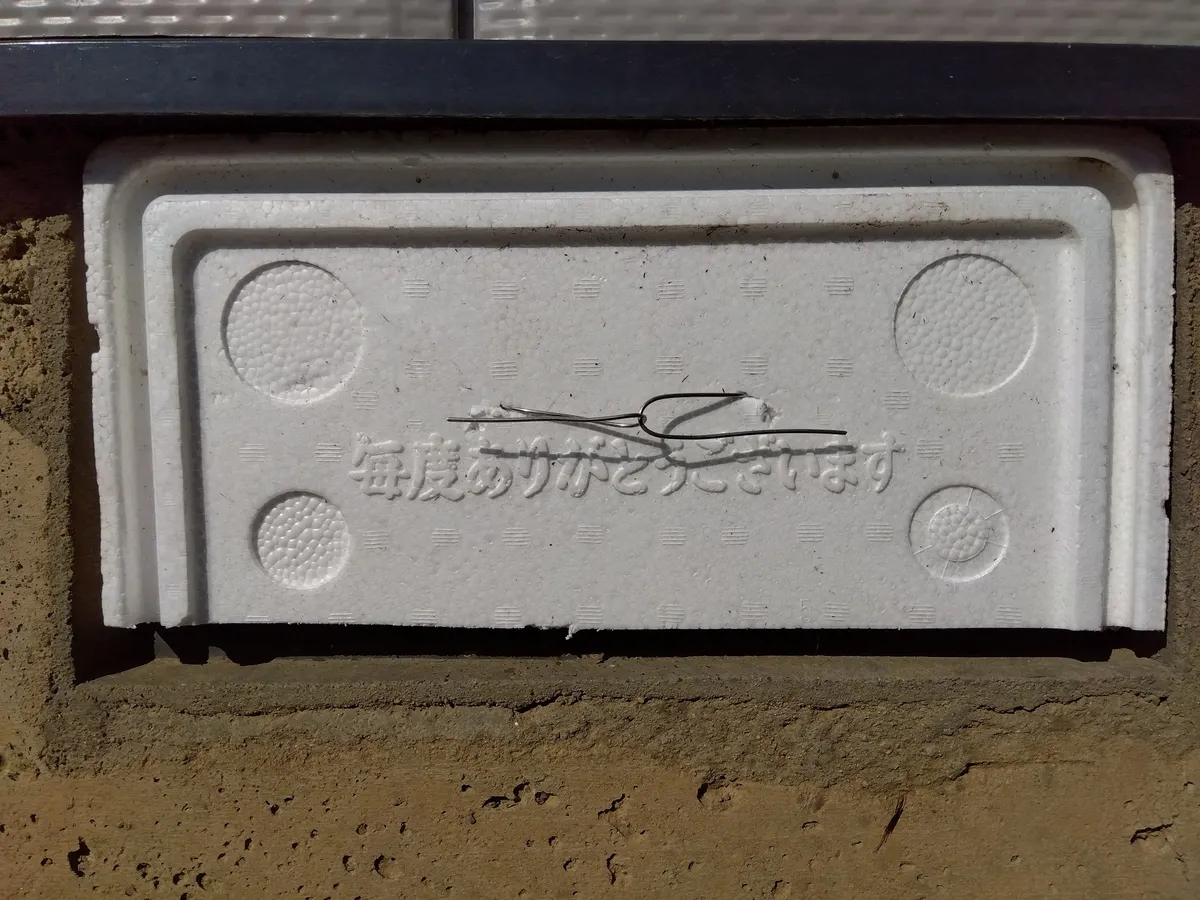 雪が積もると見えなくなるところですが、冷気が床下から少しでも遮るような工夫をしています。最近は発泡スチロールの容器が冷食運搬で各家庭に保管されていますので、今回はこれをカッターで切断して、ステンレスの針金で固定しました💪