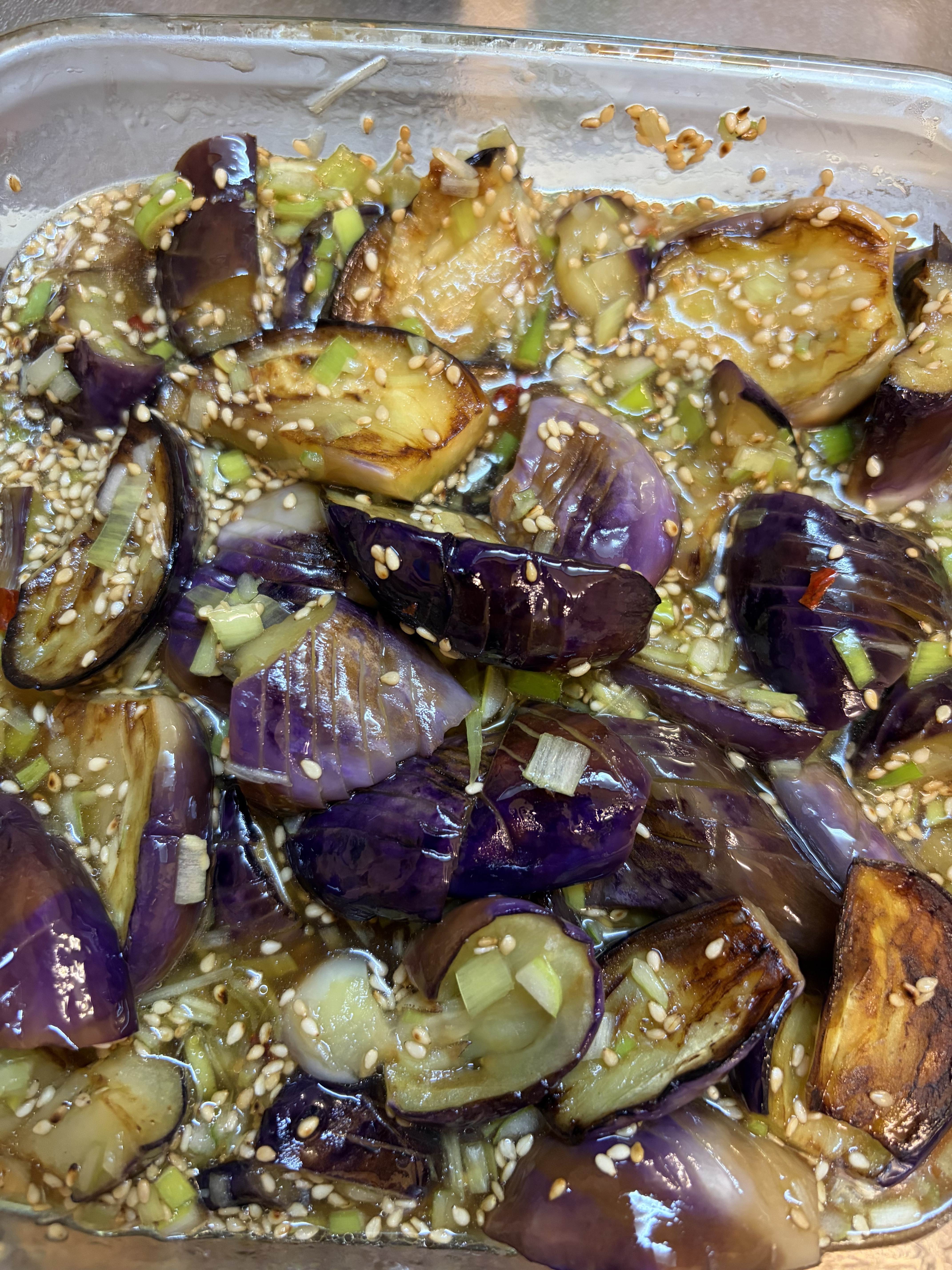④熱いうちになすをタレに漬ける。粗熱が取れてから、冷やすと味がしっかり入り、さらに美味しくなる。(そのままでも美味しいです)