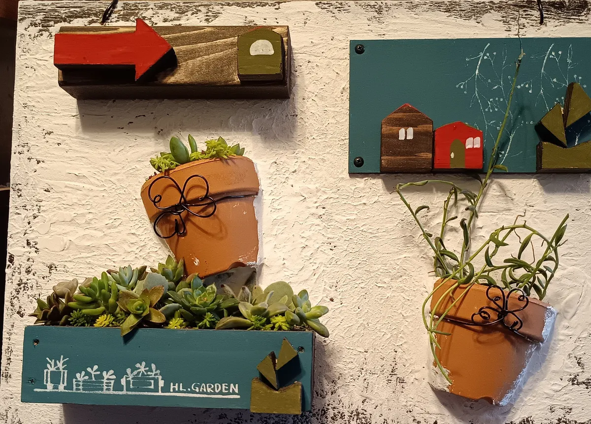 壁の植木鉢がこれまたすてきで、すてき寄せ植えですねぇ(人´∀`)