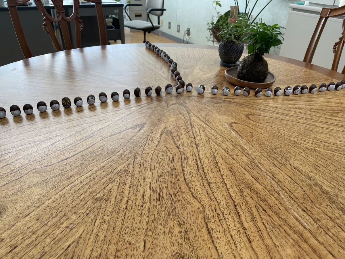 ドミノのようにずらーっと並べられたどんぐりトトロ可愛いです❤️