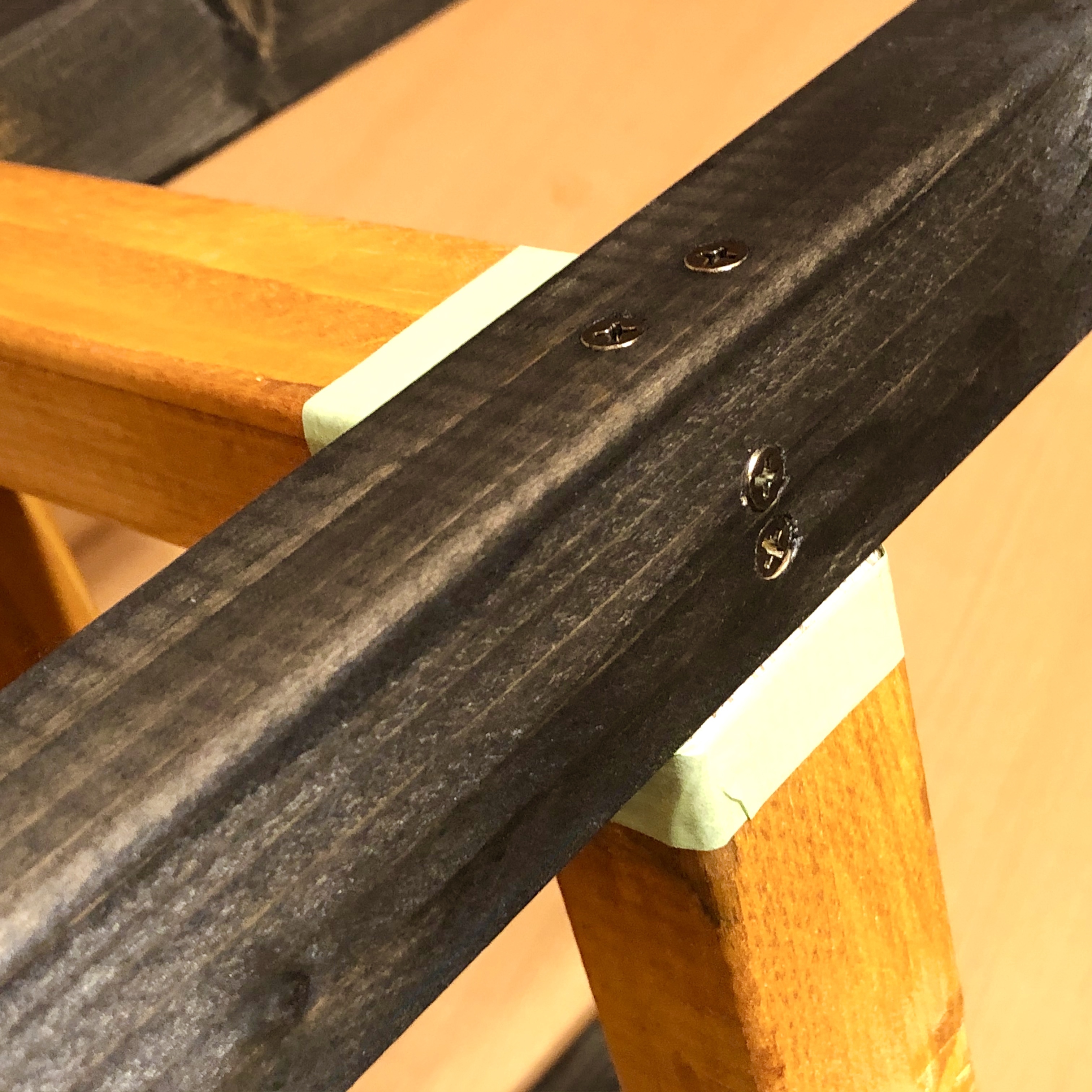 塗装中に焦り始め、メープルだったら多少はみ出ても大丈夫⁉︎…なんて思ってしまい、少しはみ出したら😱やはり、ステイン系は塗装が薄いこともあり、エボニーブラックからメープルがまだらに透けてしまいました。結局、はみ出した部分を紙やすりで落とす作業が増え、遠回りになってしまいましたが…。