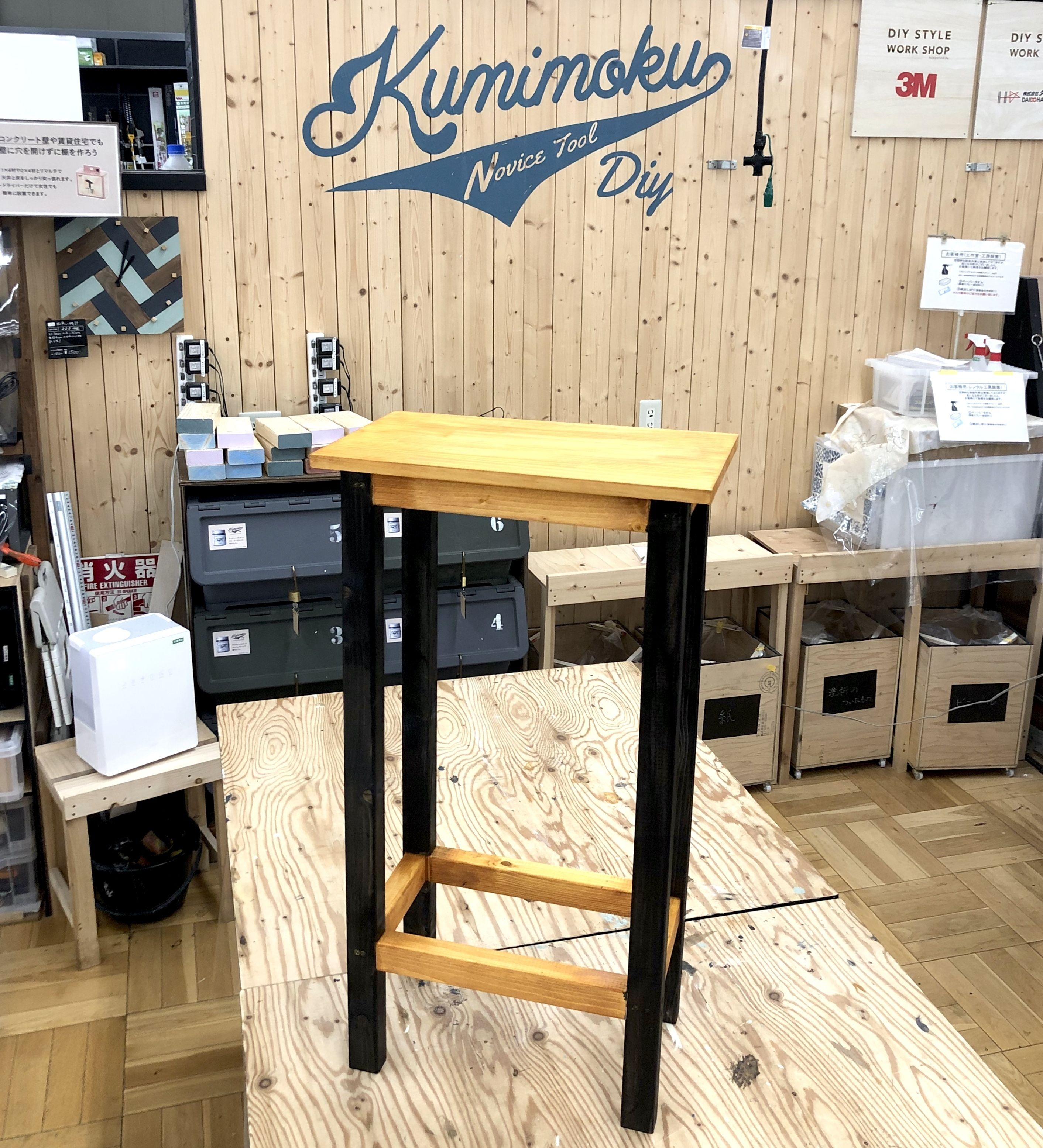 ツートンカラーのハイテーブル。二色塗装できるということで、色々考えた末、縦の脚の部分だけエボニーブラックにしました。