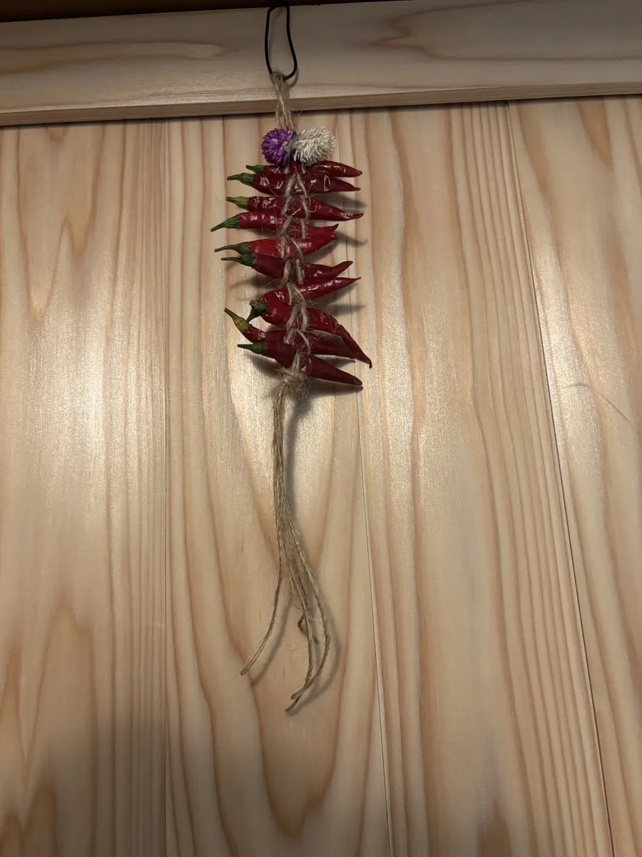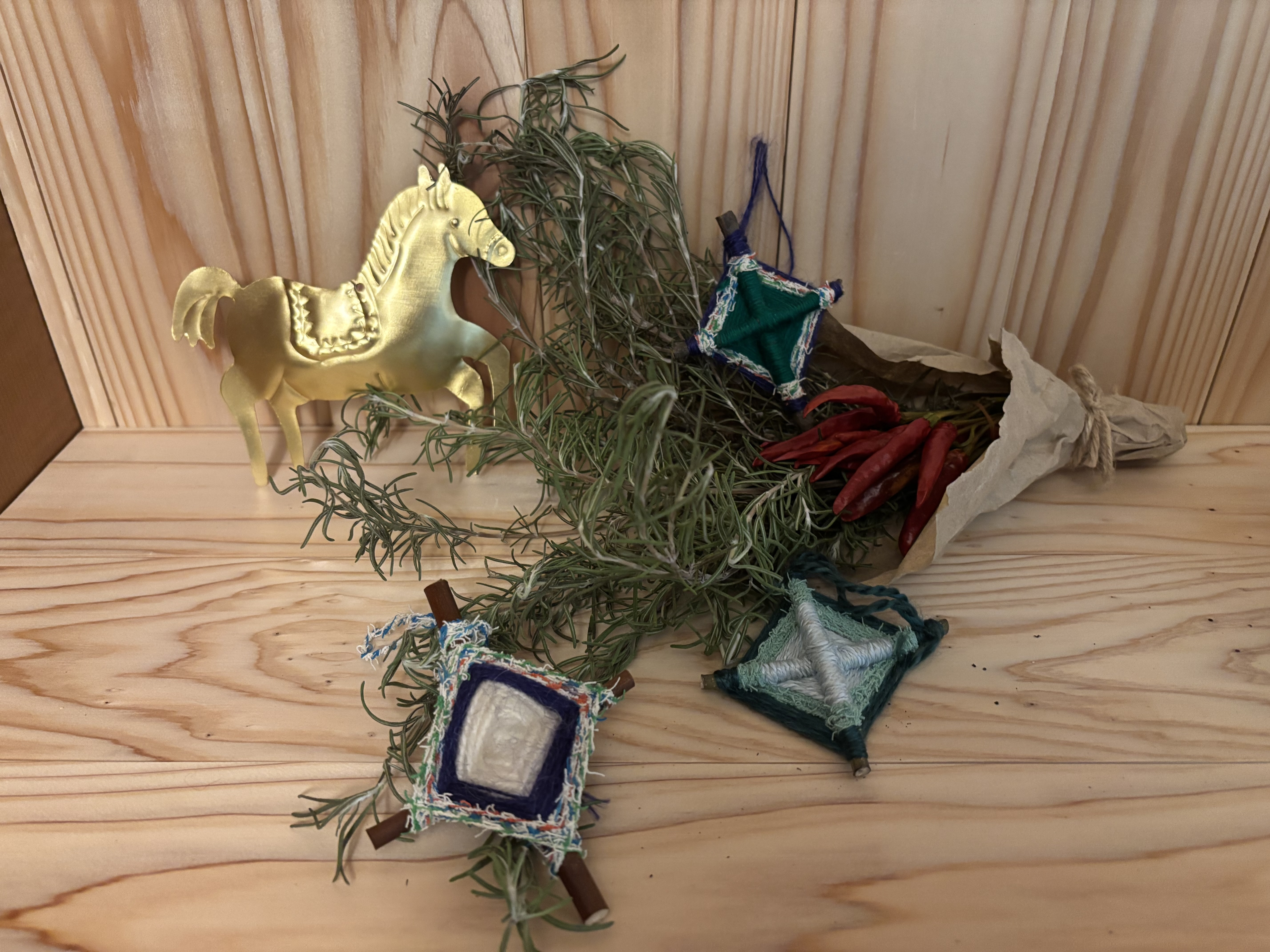 この度私が1番気に入ったのは植物の枝に毛糸🧶を巻き付ける《十時編み》飾りです。(桜、くろがねもち?梅など)
