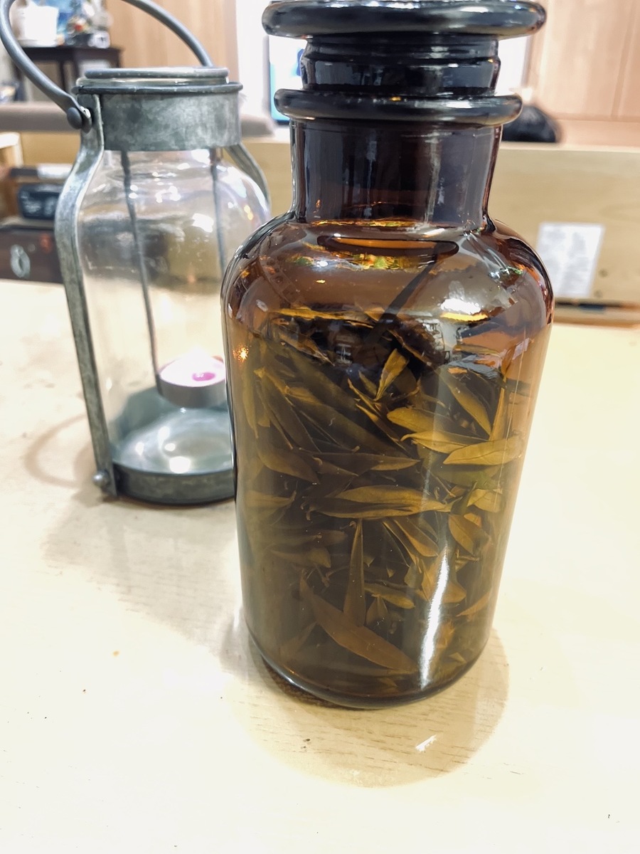 感想させて、薬瓶に入れたオリーブ🫒の葉。