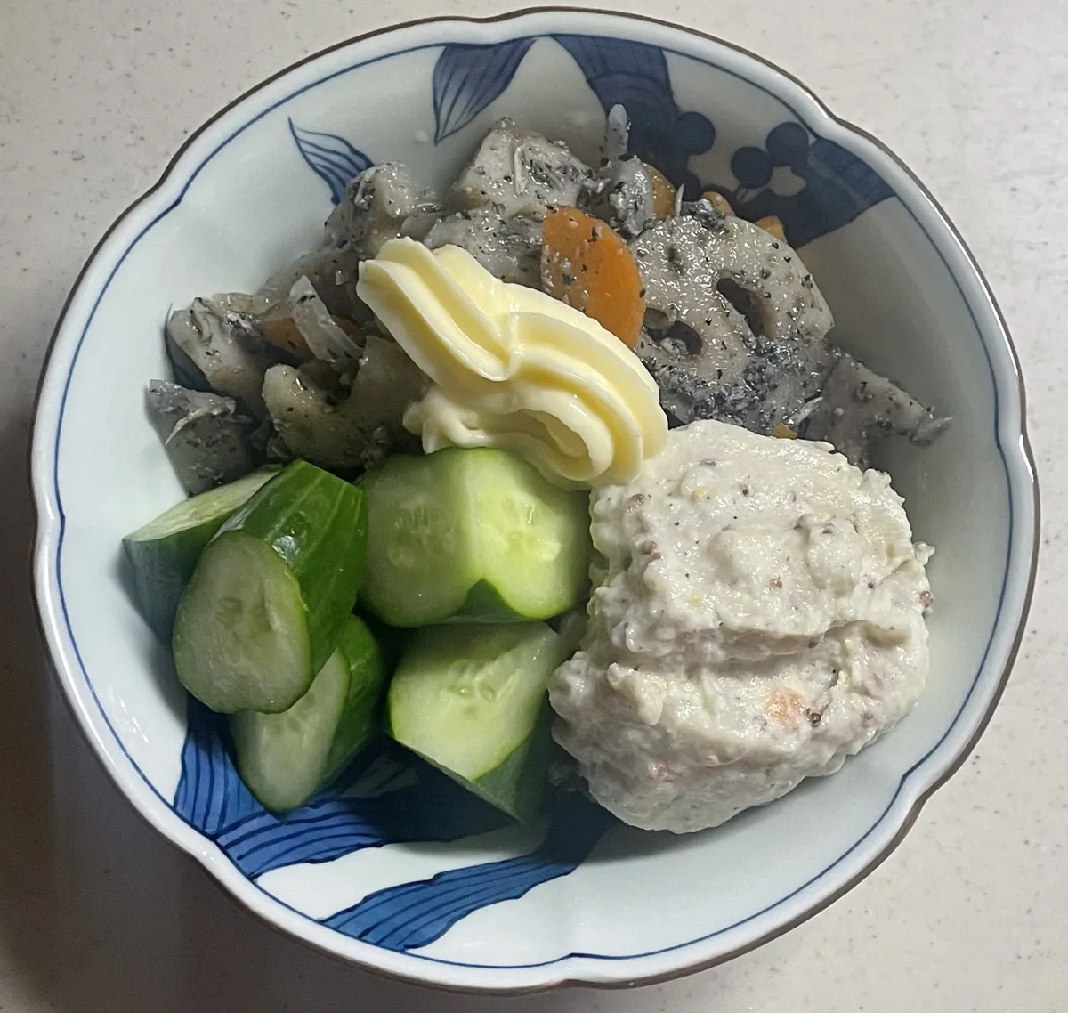 繋ぎものの蓮根サラダ・胡瓜を加えて頂いたぁ〜😋⚙️🥒🥗✨