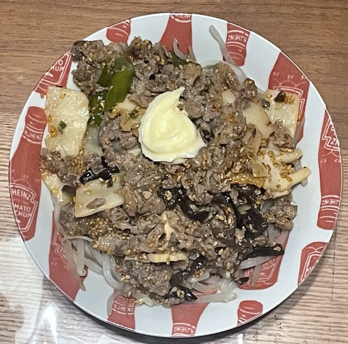 お次はレンチンもやしの上に、豚小間・玉葱・葱青身・筍・木耳で作ったらしい、何味か知らんがおそらくは木耳入れとるのでダシダやら焼肉のタレ辺りをブレンドして作ったんじゃないかと推測の謎炒めぇ〜🤣🙌🔍✨