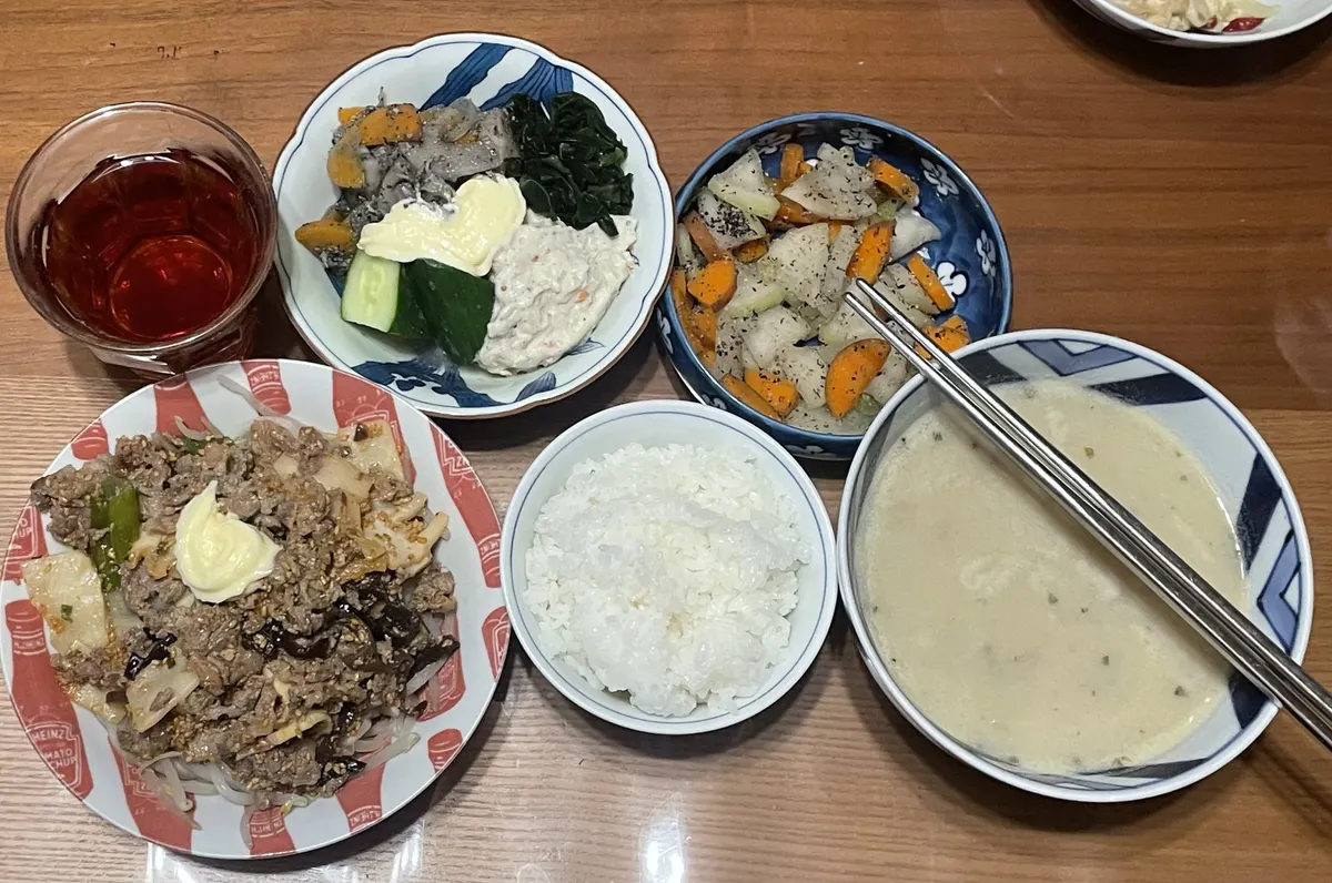 この日のその他ラインナップは、自家製大根と人参の浅漬け・謎の豆乳クリームスープ✨