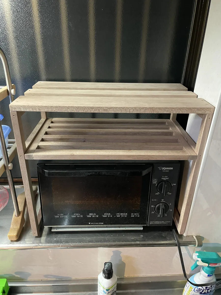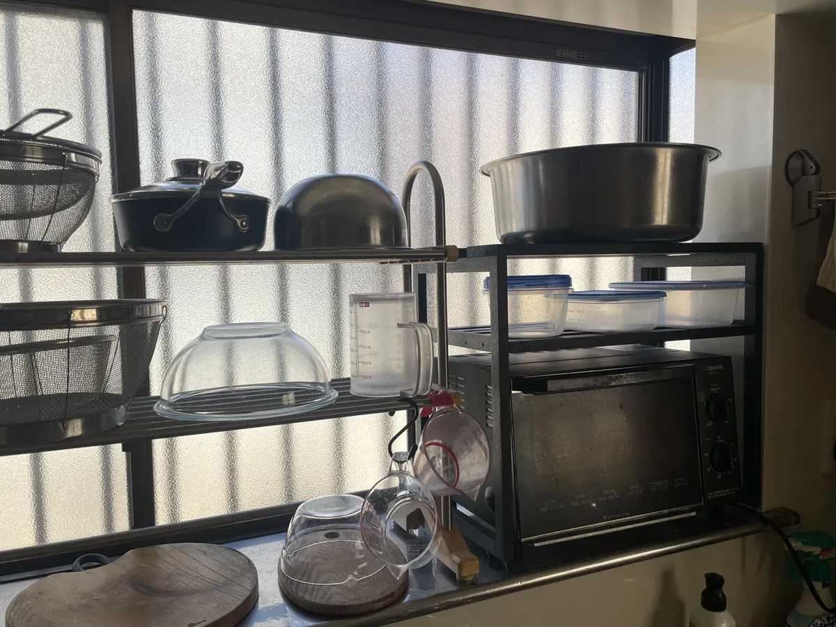 キッチンのシンクに置いてるステンレスの洗い桶の置き場に難儀してて、逃がせるスペースを考えて、空間利用の収納を作りました。