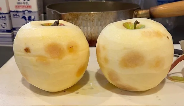 今回はマイストアで売ってた訳ありシナノスイートを使ったんですが、皮をむくとやはり隠れ打ち身が。